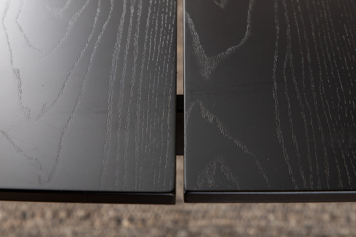 Stilsäkert, lyxigt och tidlöst - Matbord Pelle skapar ett modemedvetet intryck i ditt hem! Designen är genomtänkt med raka nordiska former som ger en stilren känsla, smala ben i järn som har en dekorativ mässingknopp på toppen och en springa i bordsskivans mitt som blir en läcker detalj. Den genomgående svarta kulören är enkel att matcha och står sig över tid. Bordsskivan är i MDF faner, följ våra skötselråd för bäst tips så får du ett hållbart och smäckert matbord till veckans alla måltider!