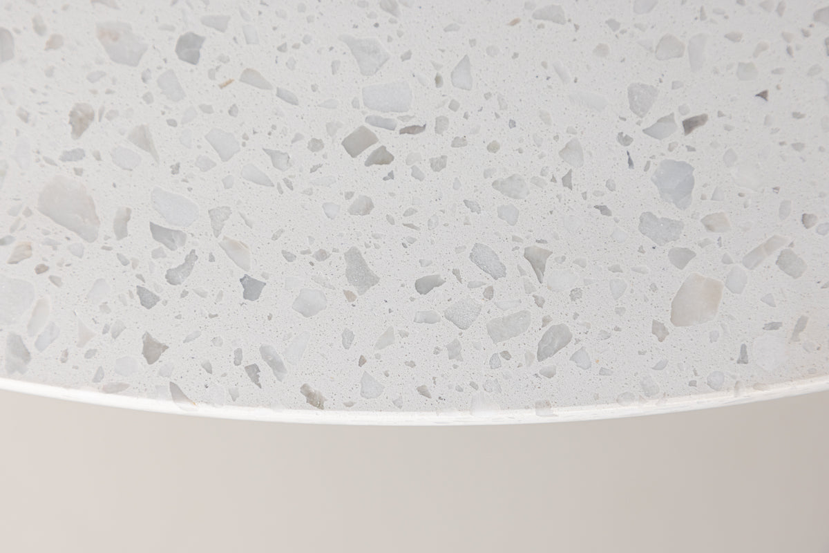 Razzia, ett modernt runt matbord i vacker terazzo med vit finish och en stomme i svart metall. Här kombineras robust design med nätta former. Den runda bordsskivan skapar ett hemtrevligt och inbjudande intryck till rummet - här hamnar ingen på kanten! Möblera smart, snyggt och stilrent med ett iögonfallande matbord. Matcha med valfria stolar för att sätta en personlig prägel på inredningen. Skötselråd: Nya marmor- och terazzoskivor ska alltid behandlas ett par gånger i början. Skivan ska förslagsvis behandlas med ”Protect Marble & Stone” från Leatchermaster alternativt, stryk ett tunt lager med parafinolja/vitolja. Låt gärna oljan ligga på ytan ett tag, torka sedan av och polera. Vid daglig rengöring och som ett bra skydd, använd en fuktad disktrasa och vanligt såpvatten. Såpan lägger sig som en hinna och tillför ett visst skydd.