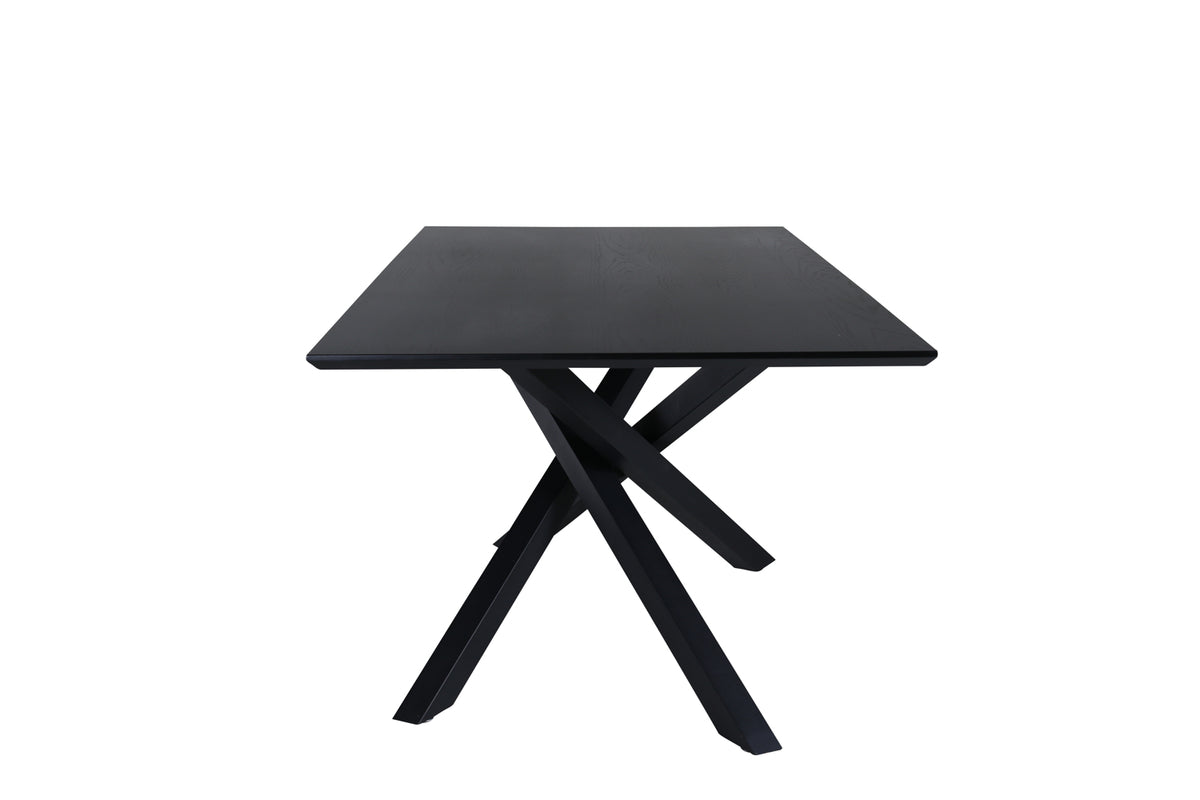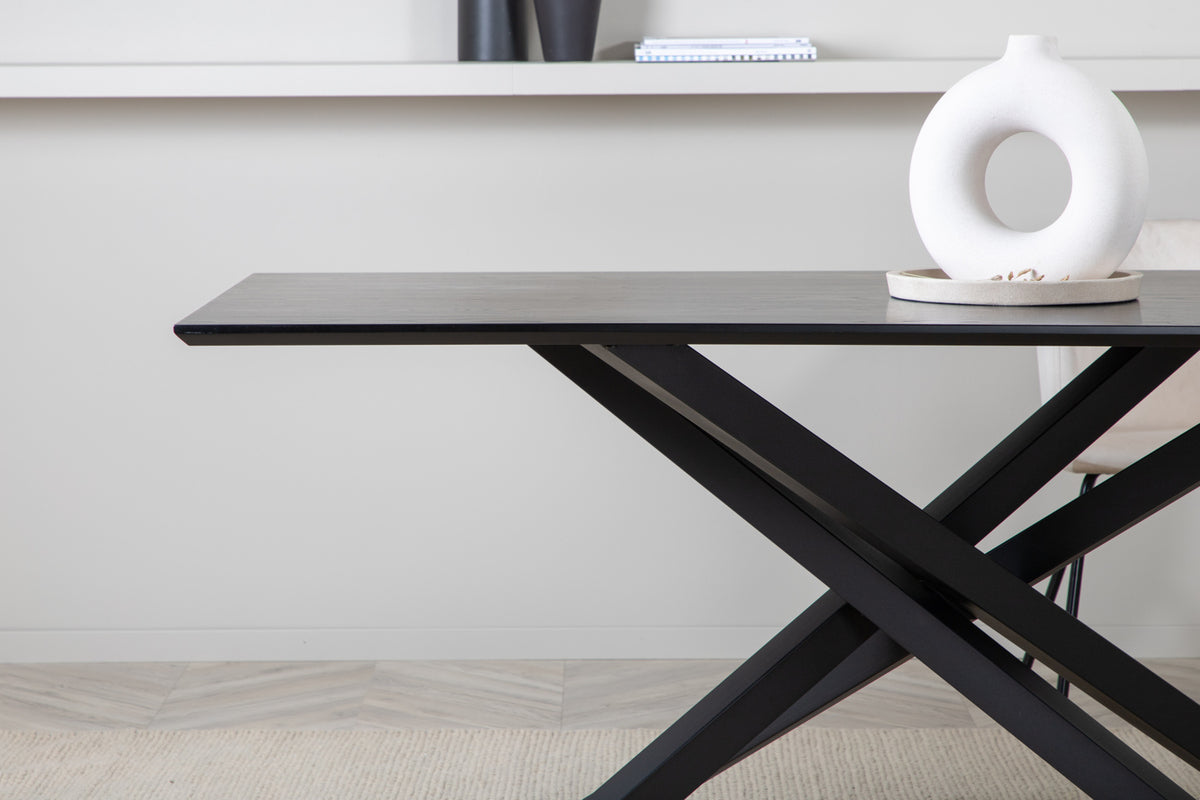 Piazza, vårt omtyckta rektangulära matbord med lyxig känsla och trendiga detaljer i designen. Bordsskivan i svart kulör är tillverkad av MDF faner. Stommen har en läcker look med kryssben i svart järn som skapar ett stadigt blickfång. Ett designbord som sticker ut i varje rum och kommer garanterat locka dina gästers blickar. Skapa en härlig mittpunkt för dig och din familj att samlas runt!