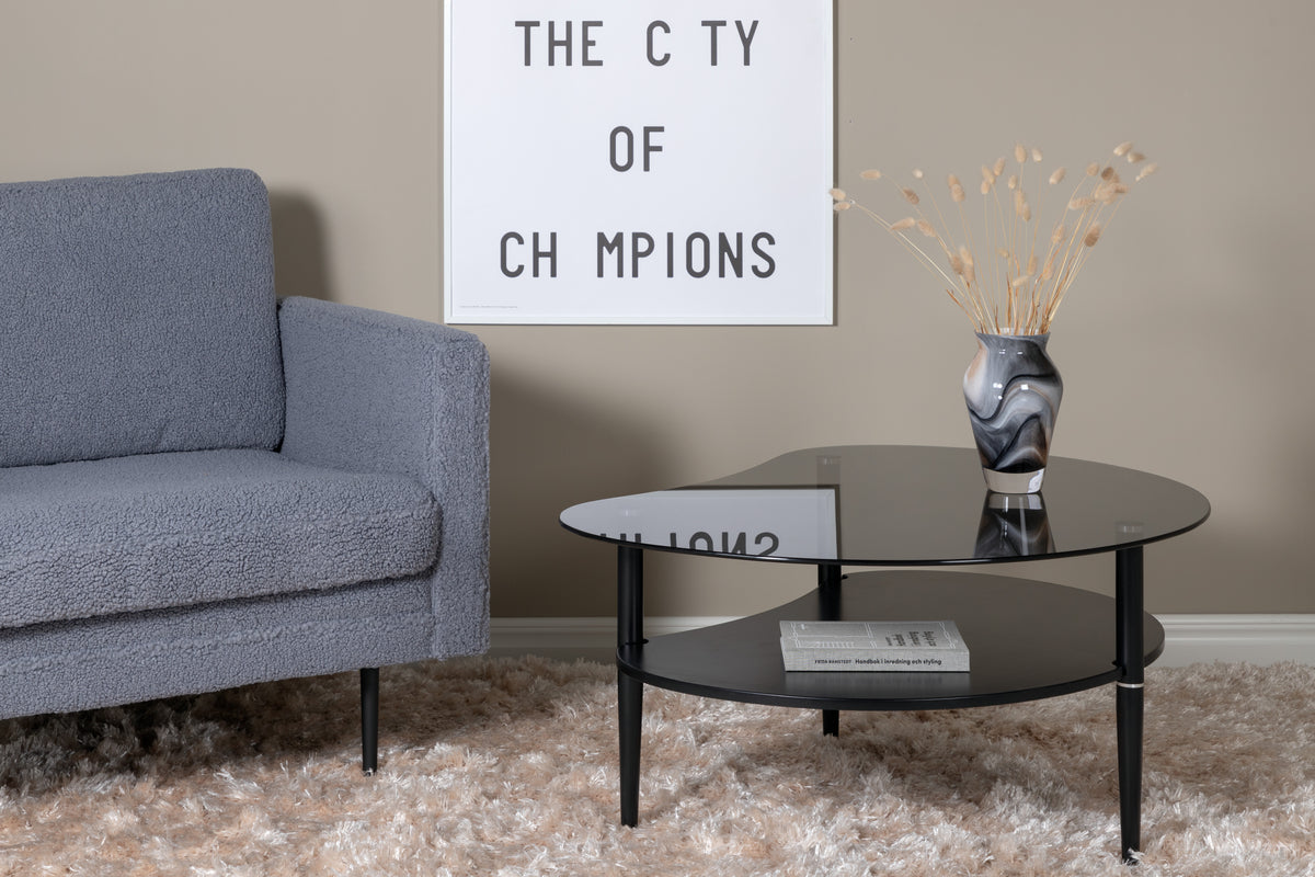 Med Egg får du ett unikt och praktiskt soffbord att placera i vardagsrummet! Bordet har en unik form med en bordsskiva i svart glas tillsammans med en praktisk hylla undertill, perfekt för förvaring eller dekoration. Soffbordets ben är i svart stål och är rundade för en lugnare känsla. Den enkla färgen och de mjuka formerna skapar en varm och hemtrevlig känsla. Placera på en mysig matta och pryd med vackra dekorationer för ett helhetsintryck.