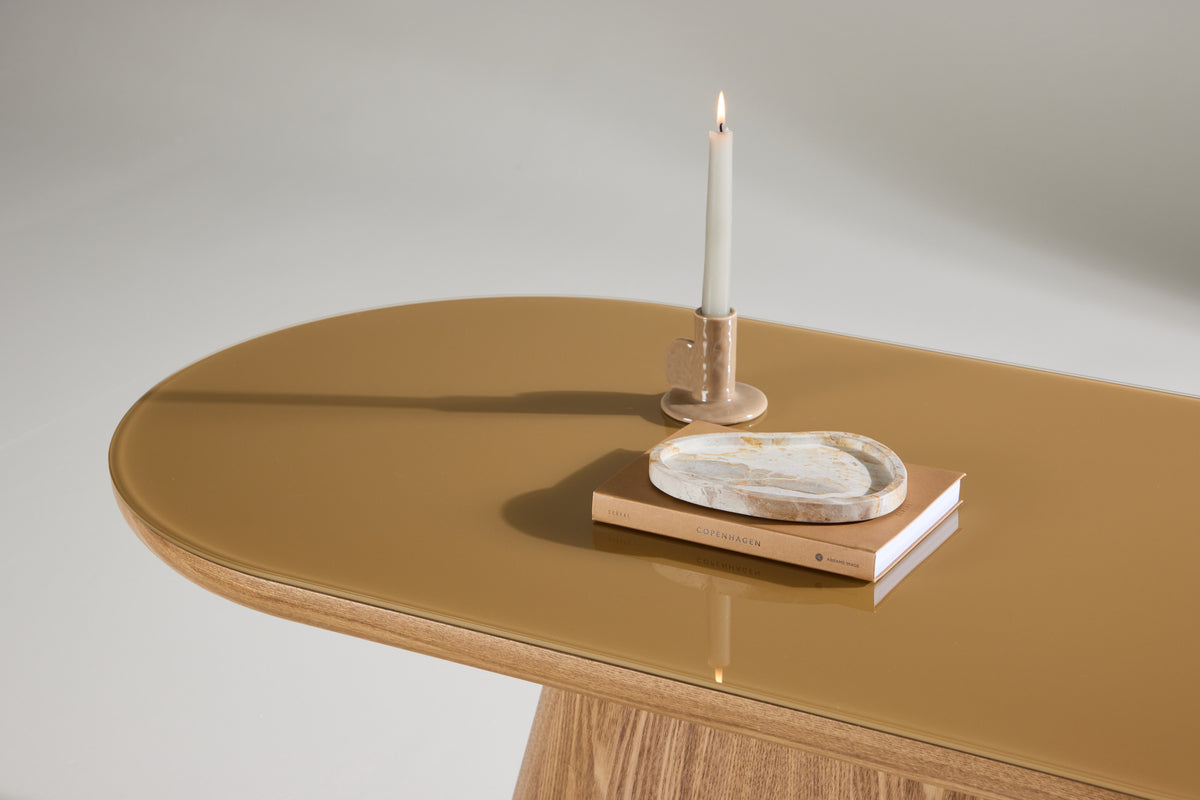 Den ovala bordsskivan i glas ger soffbordet en luftig och öppen känsla, vilket bidrar till att rummet känns större och mer inbjudande. Glasets transparens och reflektioner skapar en ljus och lätt atmosfär, samtidigt som det ger bordet en tidlös och elegant estetik som passar in i många olika inredningsstilar, från minimalistiskt till modernt.