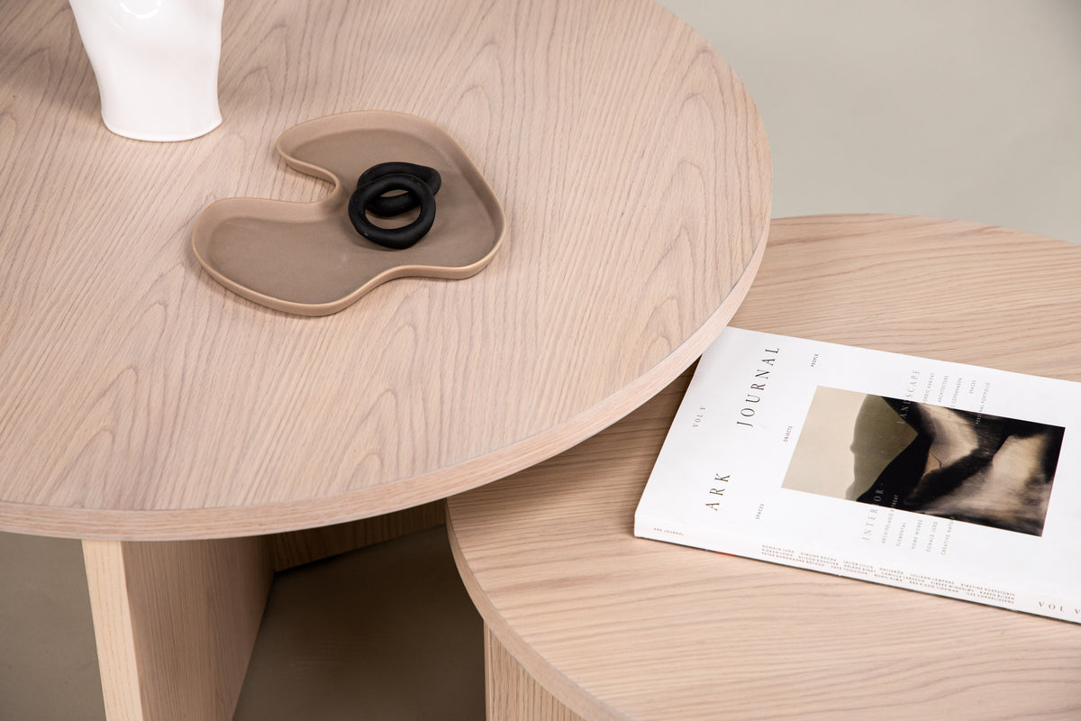 Upptäck den eleganta Saltö soffbordsgruppen, bestående av två runda bord i olika storlekar. Med sin stilrena beige design och tidlösa estetik är Saltö en perfekt tillskott till ditt heminredning. Det stora bordet i Saltö-gruppen har en imponerande diameter på 85 cm, medan det mindre bordet har en diameter på 65 cm. Dess olika storlekar kompletterar varandra på ett harmoniskt sätt och ger dig flexibilitet att anpassa dem efter din inredningsstil och ditt utrymmes behov. Saltö-soffborden är tillverkade av MDF och faner, vilket garanterar hållbarhet och stabilitet. Den beige ytan ger en elegant och sofistikerad känsla som passar perfekt in i olika inredningsstilar och skapar en modern atmosfär. Ge ditt vardagsrum eller vilket annat rum som helst en touch av stil och elegans med Saltö soffbordsgrupp. Skapa en samlingsplats för dina nära och kära eller njut av en stunds avkoppling på egen hand. Välj Saltö för att förgylla ditt hem med dessa vackra och funktionella soffbord.