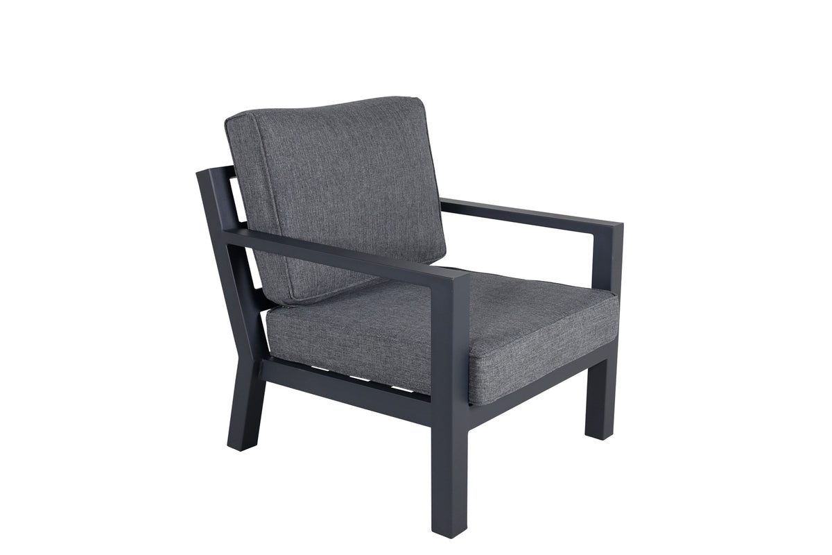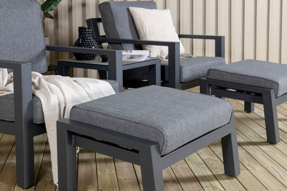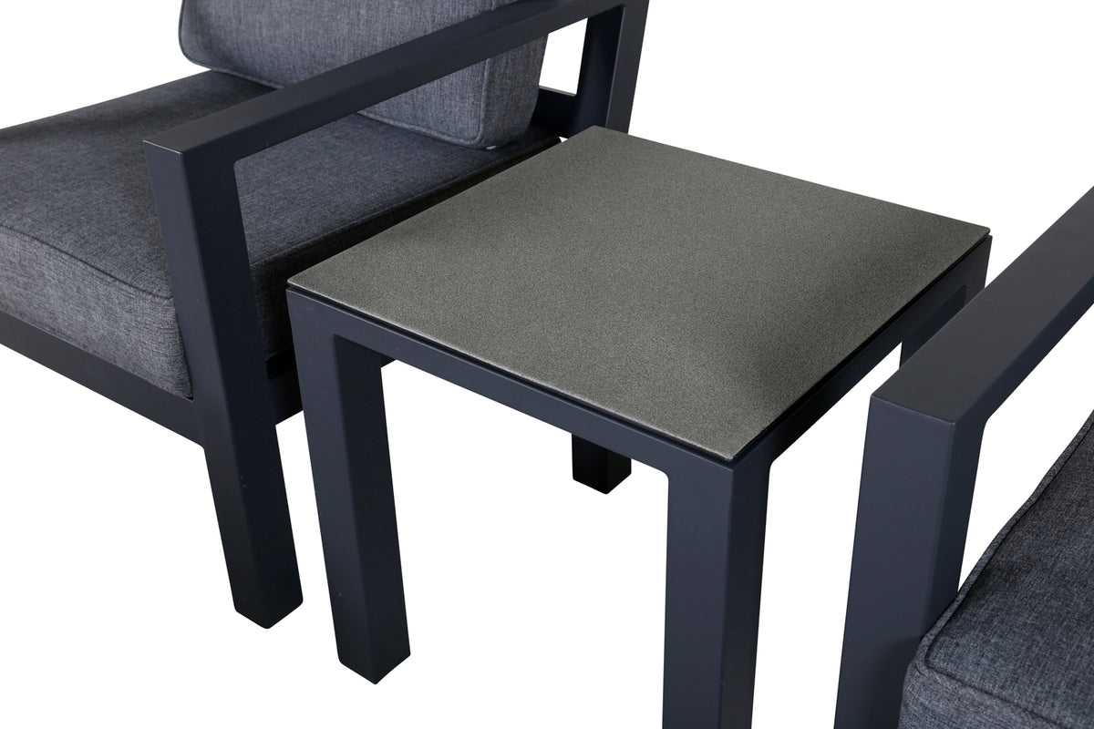 Skapa ett blickfång som imponerar med ett bekvämt loungeset från serien Barcelona. Bestående av två loungestolar i robust design tillverkade av svart aluminium och ett tillhörande bord med en toppskiva i stilrent glas. Slitstarka dynor i svart kulör ingår. Bordets mått: 50x50x50 cm. Stolens mått: 159x84x77 cm. Sittmått: 63x55x31 cm. Ingen montering krävs. Här kan du koppla av och njuta av sommarens uteliv på altanen! Skötselråd: Utemöbler i aluminium och rostfritt stål bör rengöras regelbundet med vatten och mild tvål. Skölj alltid noggrant med rikligt med vatten, något som blir extra viktigt om möblerna är placerade på ett havsnära avstånd där salt kan transporteras via luften.