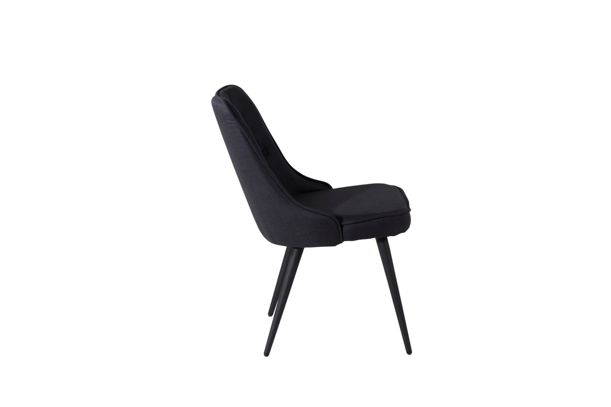 Inred hemmets hjärta med matstolar i serien Velvet Lyx för ett mer elegant blickfång i vardagsrummet! Stolen har en helklädd design i smäckert svart polyestertyg med knappar och dekorsöm i ryggen som blir till en snygg detalj. Ben i svart pulverlackerad metall och mjuk stoppning i rygg och sits för extra komfort. Sitt bekvämt och snyggt! Lättare montering krävs.