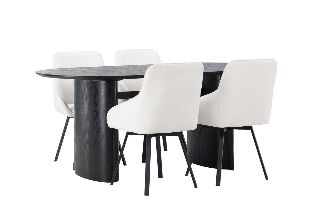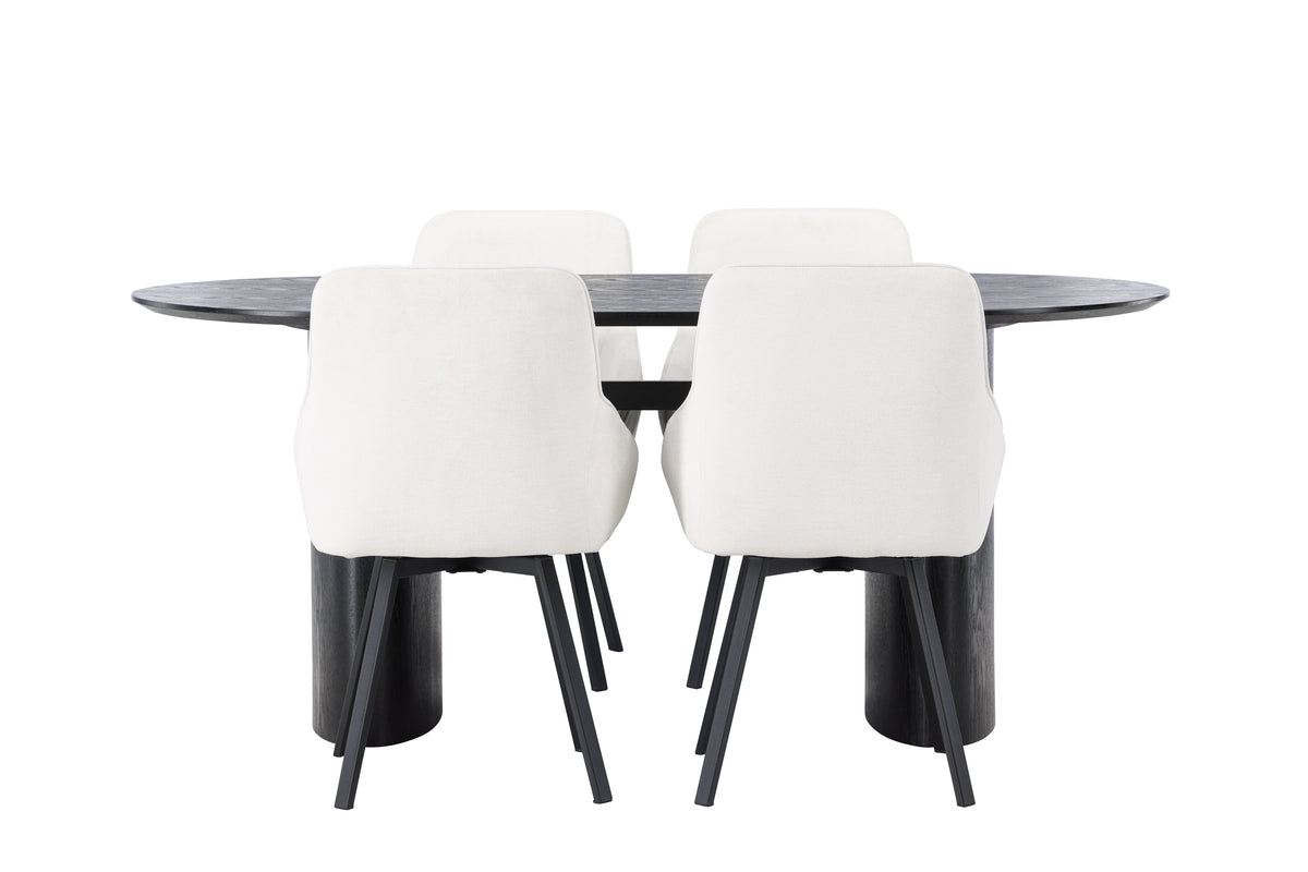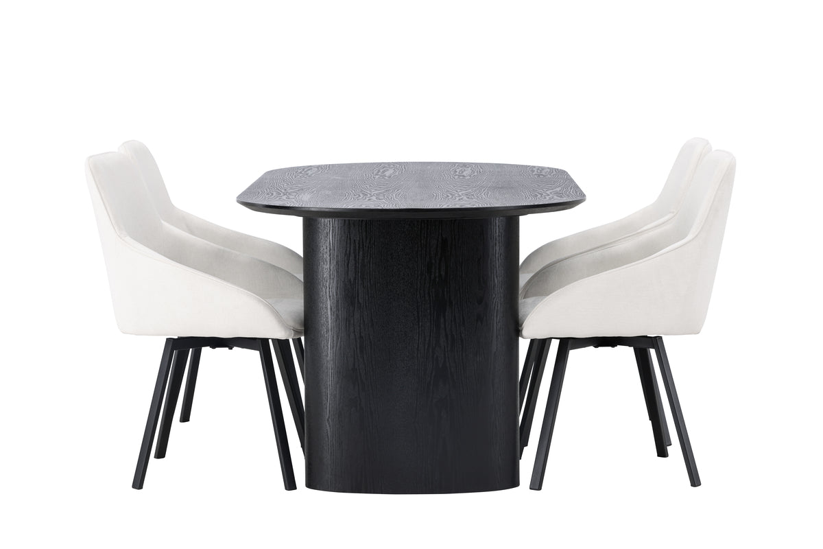 Det blir inte bättre än såhär! Det ovala matbordet Isolde i svart kulör har en modern utformning med en oval bordskiva i MDF och robust stomme som ger ett stadigt intryck. Det levande materialet ger smakfull rörelse till blickfånget. Här i stilren kombination med beige matstolar från serien Rosie. Stolen har en helklädd sits med integrerade armstöd i beige tyg och lätt utsvängda stolsben i svart metall. Den mjuka sitsen är stoppad för extra komfort och bjuder in till långa trivsamma middagsstunder. Bordets mått: 180x75cm.