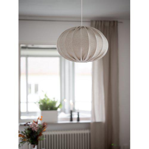 Takskärmen Hilma ger ett mjukt intryck i rummet, här klädd i ett vackert linnetyg med fin struktur. Finns i flera färger och storlekar. Inklusive textilsladdställ TT-01-N, 2,1m vit. Takkontakt säljes separat.