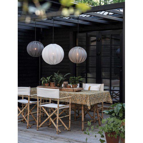 Låt vardagsrummet flytta ut! Skapa en härlig och mysig utemiljö med våra Outdoor takskärmar. Passar lika bra i uterummet som på terrassen. Denna fina takskärm är gjord i ett vädertåligt tyg och har en stomme i galvaniserat stål, som klarar att hänga ute oavsett väder. Takskärmen säljs tillsammans med Flex out lampupphäng. 2,5m lampupphäng IP44 godkänd för utomhusbruk. Med väggkontakt och E27 lamphållare för ljuskällor med max effekt på 15W.