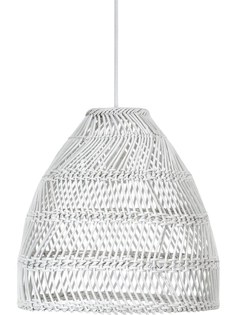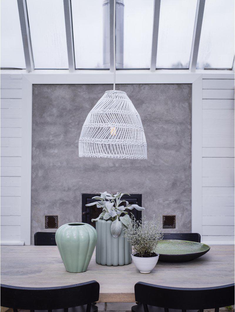 Maja takskärm i en vacker tvinnnad vitfärgad rotting. Passar lika bra utomhus under tak, i växthus och uterum som inomhus. Men tänk på att den får patina om den hänger ute. Höjd 59,5cm, bredd 53cm och djup 53cm. Skärmen har E27 ringfäste, sladdställ för inomhus eller utomhusbruk köpes separat. Skärmen är anpassad för ljuskälla med max 40W.
