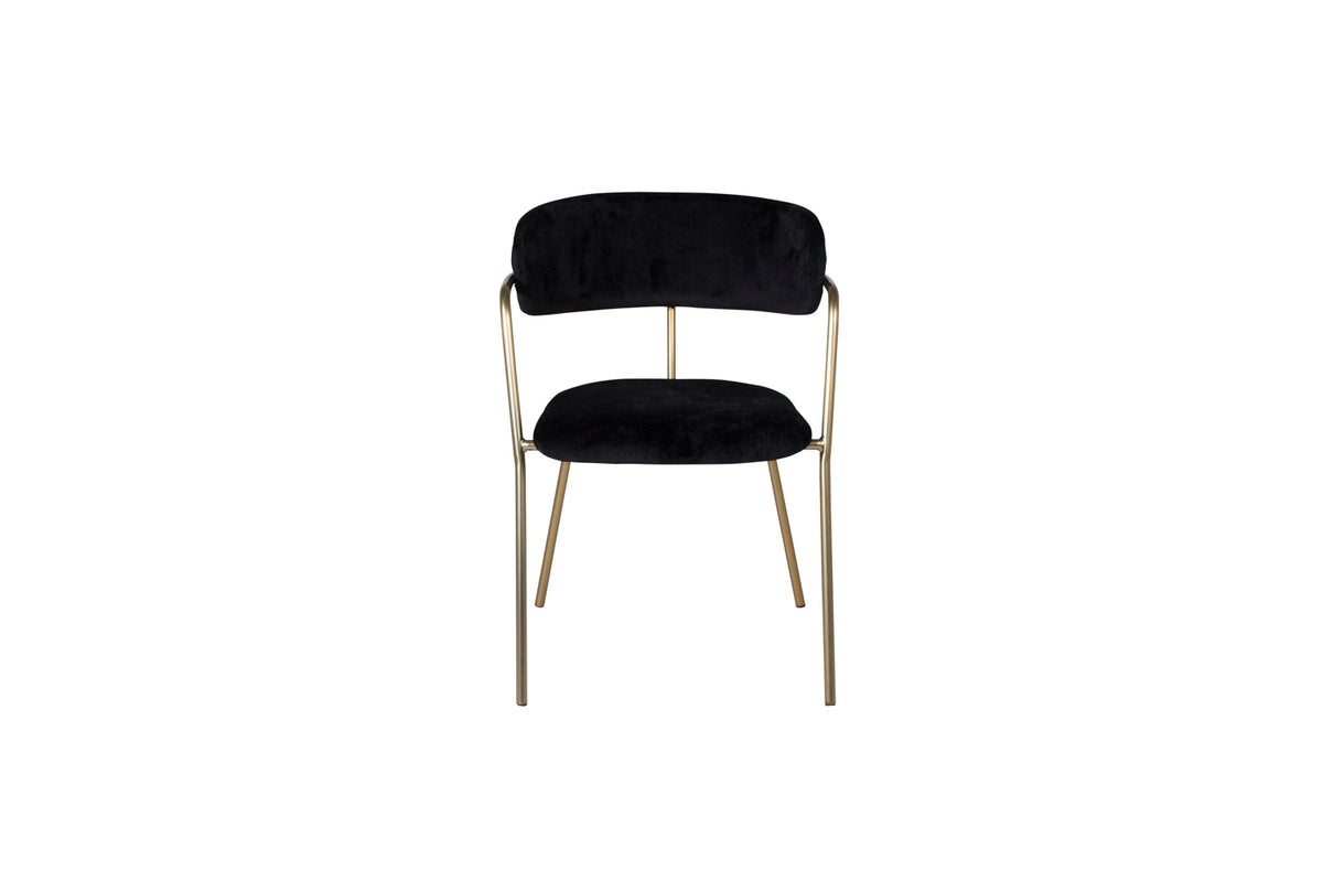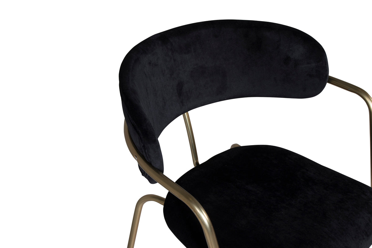 Skapa ett trendigt blickfång i hemmets hjärta! Den här stilrena matstolen från serien Arrow har en modern stomme med ben och integrerade armstöd i mässings folierad metall. Ryggen är lätt rundad i samma material som sitsen, stoppad svart sammetstyg. Lyft inredningen i ditt hem till nästa nivå! Lättare montering krävs. Skötselråd: Använd textilspray för att impregnera textilen innan du börjar använda den, det kommer även göra att eventuell smuts och fläckar blir lättare att ta bort framöver. Ta bort fläckar med en gång, gnid inte utan försökt suga upp varsamt med en trasa.