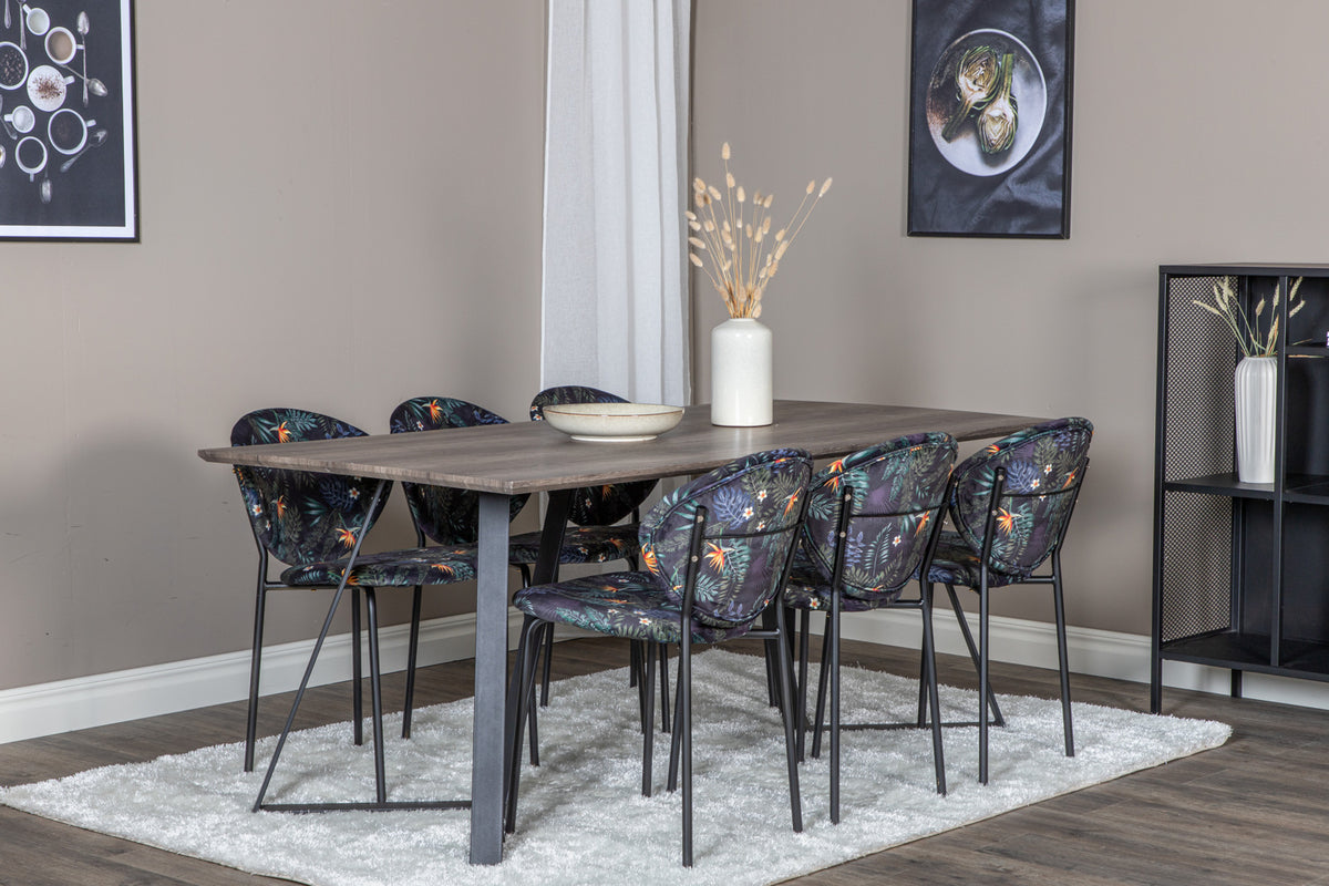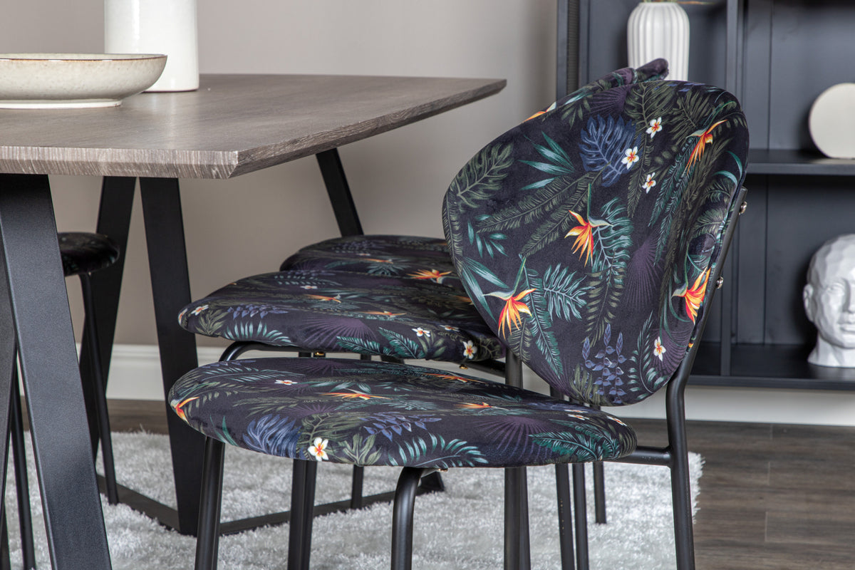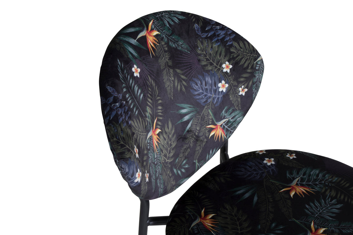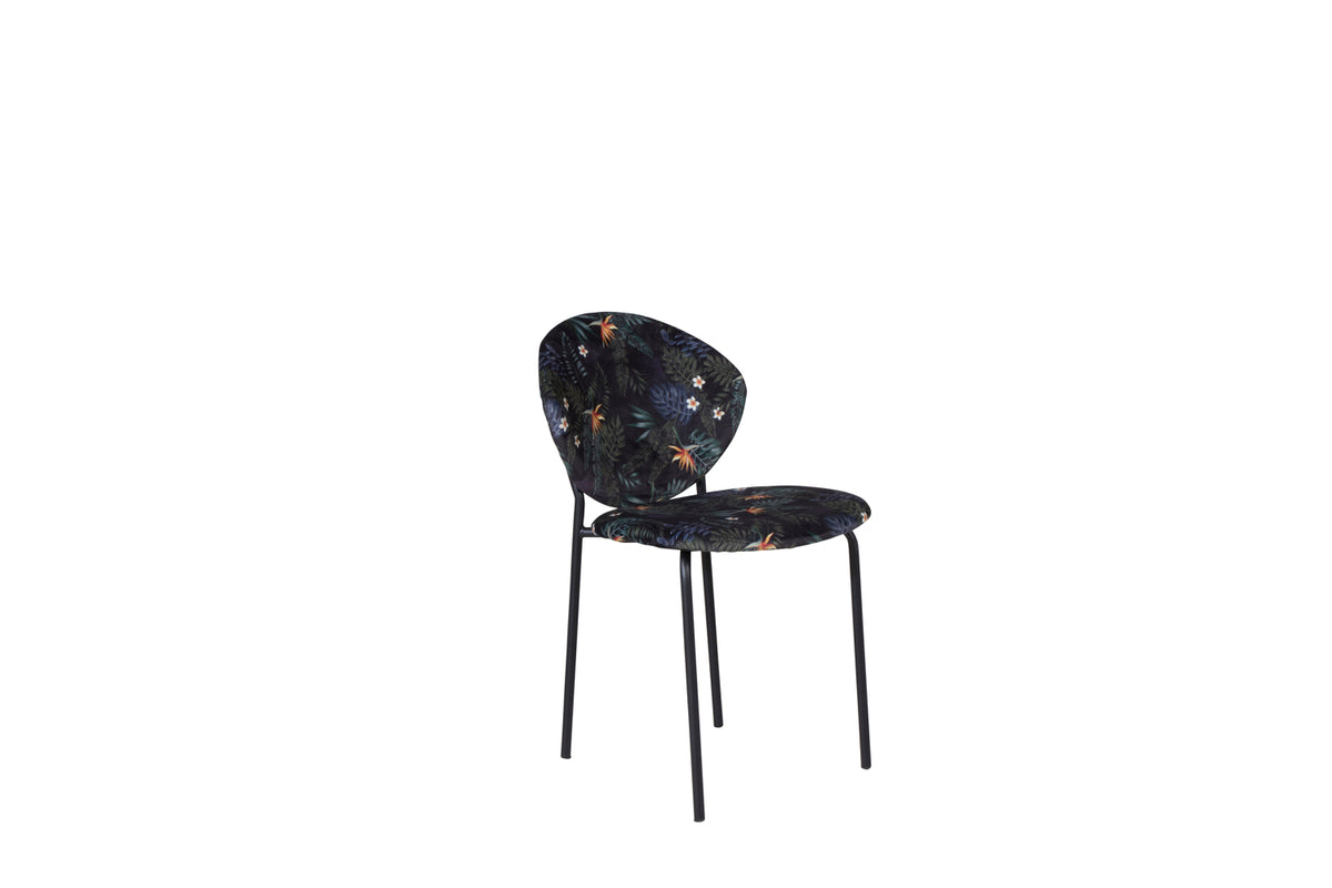 Skapa ett blickfång som sticker ut med flerfärgade matstolar från serien Vault! Den här matstolen har en stomme och ben i pulverlackerad stål och en snygg design med rund rygg. Rygg och sits i stoppad svart blommönstrat polyestertyg som skapar ett personligt intryck i inredningen. Lättare montering krävs. Skötselråd: Ta bort fläckar med en gång, gnid inte utan försökt suga upp varsamt med en trasa. Skulle fläckarna inte gå bort, prova ett fläckborttagningsmedel som du först provat på en mindre synlig del av tyget. Vi rekommenderar att större möbler skumtvättas minst tre gånger om året.