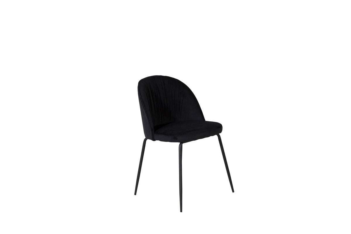 En modern stoldröm med alla rätt - bekväm, stilren och modern! Matstol Wrinkles har en exklusiv helklädd design med ben i svart pulverlackerad metall. Rundad rygg och sits med mjuk stoppning, klädd i rynkat svart sammetstyg som skapar en stilren och inbjudande helhet. Lättare montering krävs. Skötselråd: Använd textilspray för att impregnera textilen innan du börjar använda den, det kommer även göra att eventuell smuts och fläckar blir lättare att ta bort framöver. Ta bort fläckar med en gång, gnid inte utan försökt suga upp varsamt med en trasa.