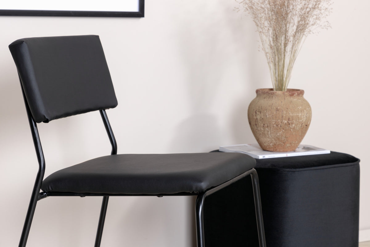 Skapa en charmig mittpunkt i hemmets hjärta med hjälp av stilrena matstolar från serien Kenth! Den minimalistiska, moderna designen skapar en luftig känsla. Stolen har en rygg och sits i svart polyuretanskinn och polyester samt dekorativt smala stolsben i järn. Lättare montering krävs. Komplettera med ett matchande bord och njut av trivsamma måltider. Skötselråd: PU går bra att rengöra med en mjuk fuktad bomullstrasa. Vid svåra fläckar kan en fuktad bomullstrasa och ett medel avsett för rengöring av ByCast & PU användas, prova först på ett icke synligt område då vissa medel kan ha olika sammansättningar.