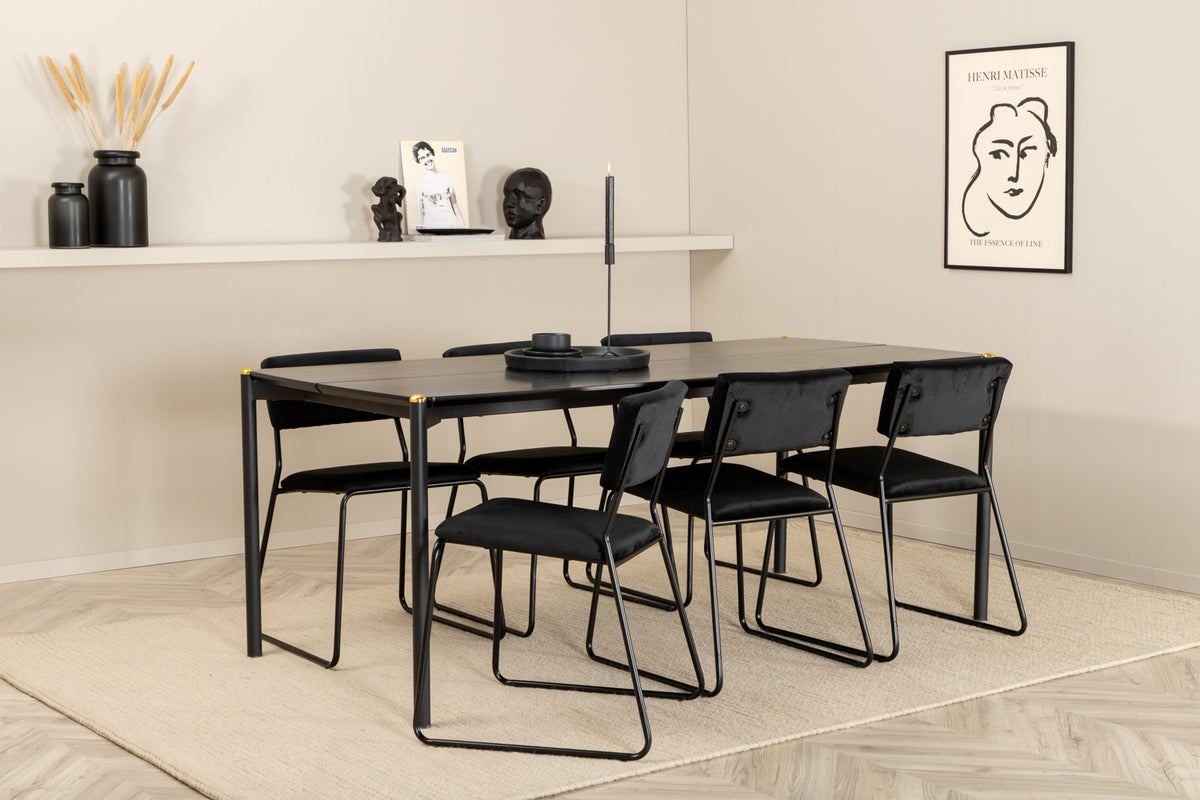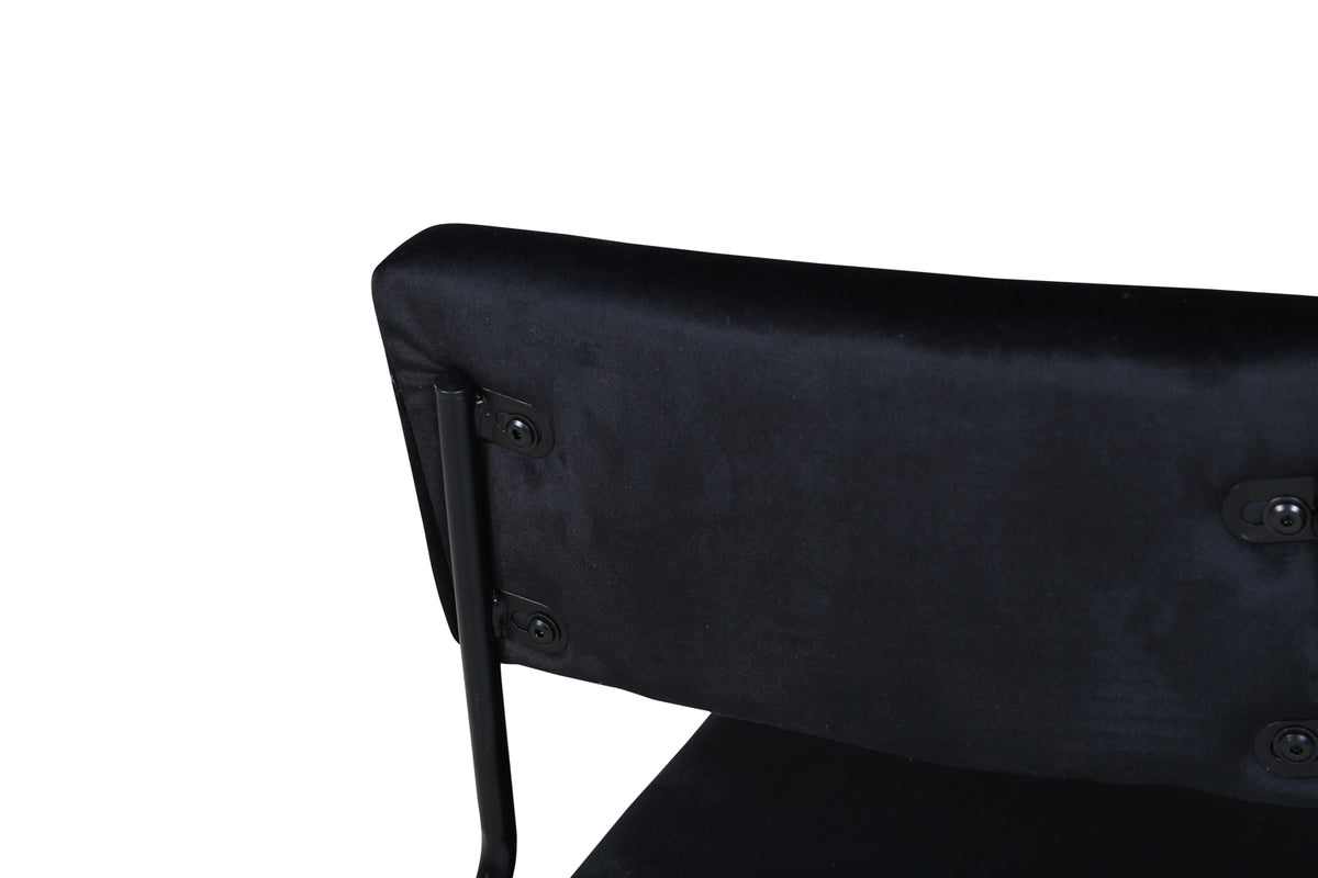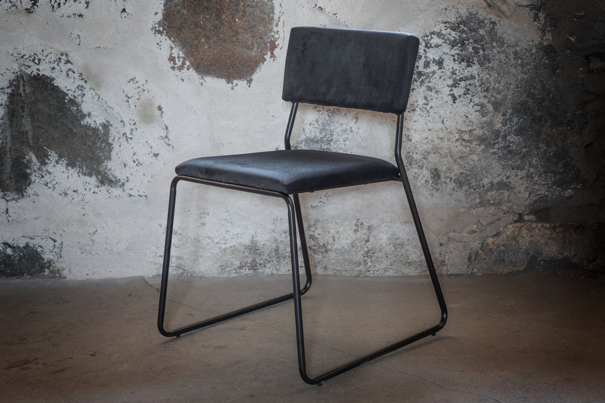 Modernt, praktiskt och stilrent - en matstol med alla rätt! Skapa en charmig mittpunkt i hemmets hjärta med hjälp av läckra matstolar från serien Kenth. Den minimalistiska, moderna designen skapar en luftig känsla till hemmets hjärta. Stolen har en rygg och sits i svart sammet och polyesterlinne samt dekorativt smala stolsben i järn. Lättare montering krävs. Komplettera med ett matchande bord och njut av trivsamma måltider. Skötselråd: Sammet har en tendens till att få tryckmärken när luggen lägger sig ner. Avtrycken kan göra att tyget ser slitet ut, vilket här helt normalt för den här typen av material. Beroende på hur ljuset faller kan tyget skifta i flertalet olika nyanser.