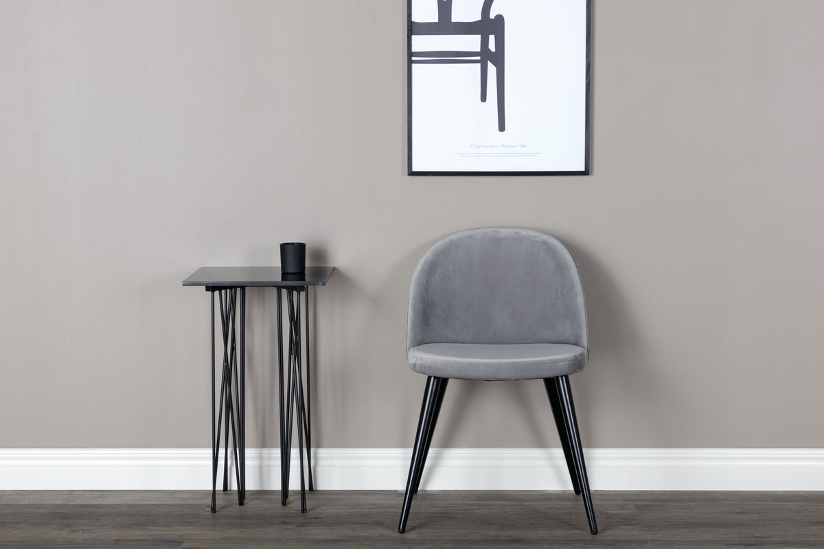 Stilren matstol i behaglig grå kulör med modern utformning – vad mer kan man önska? Den grå matstolen Velvet har en helklädd design, ben i svart pulverlackerad metall samt rundad rygg och sits i grått sammetstyg med mjuk stoppning. Slipp kompromissa mellan komfort och design! Lättare montering krävs.