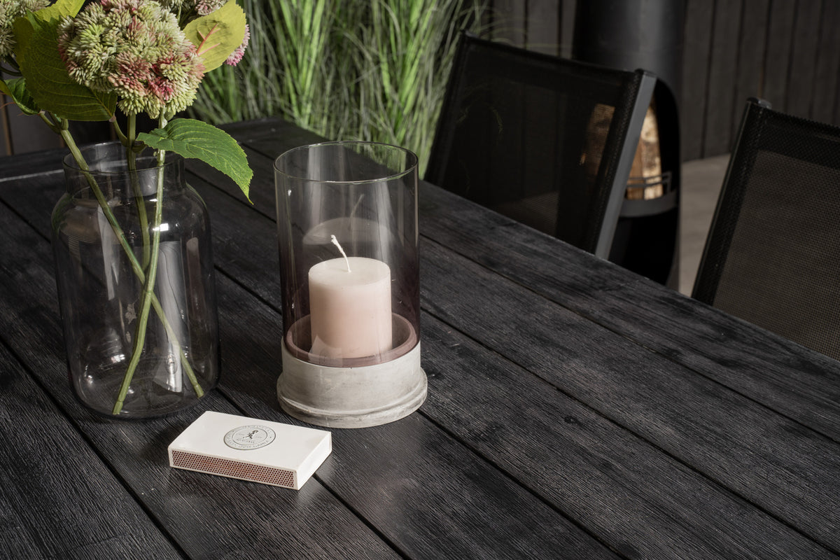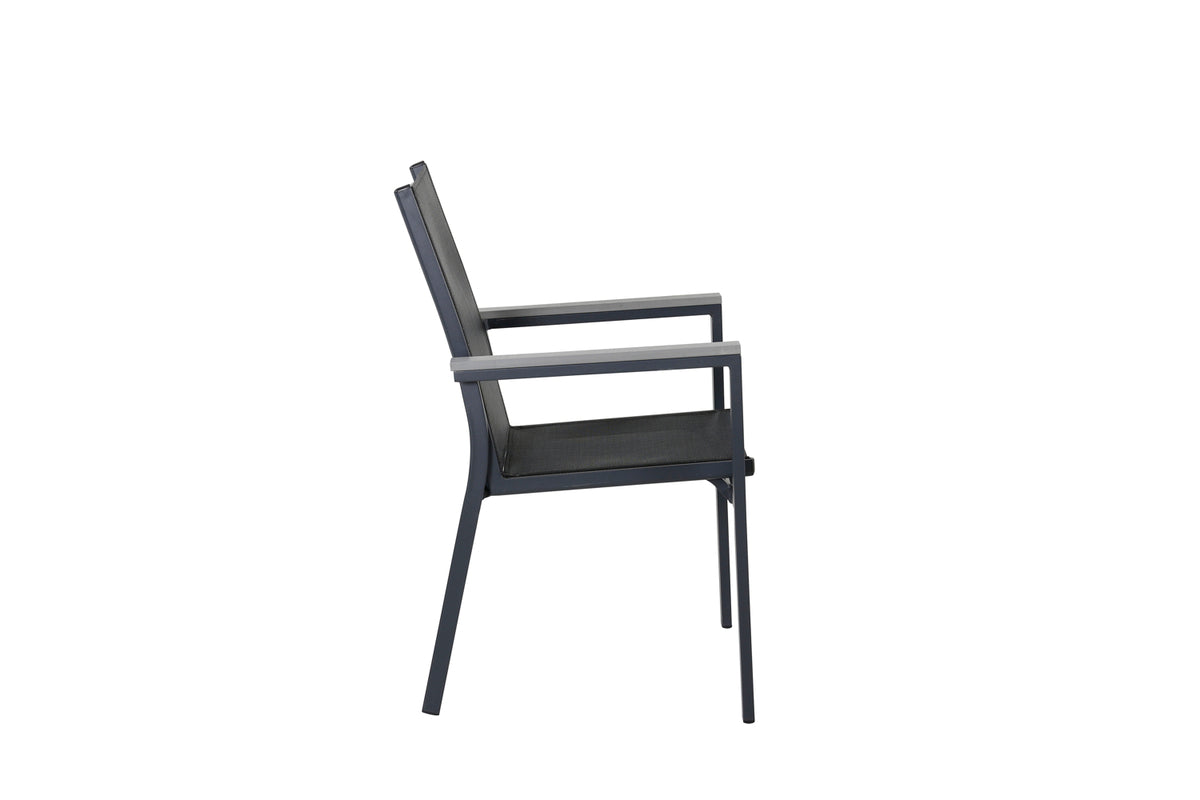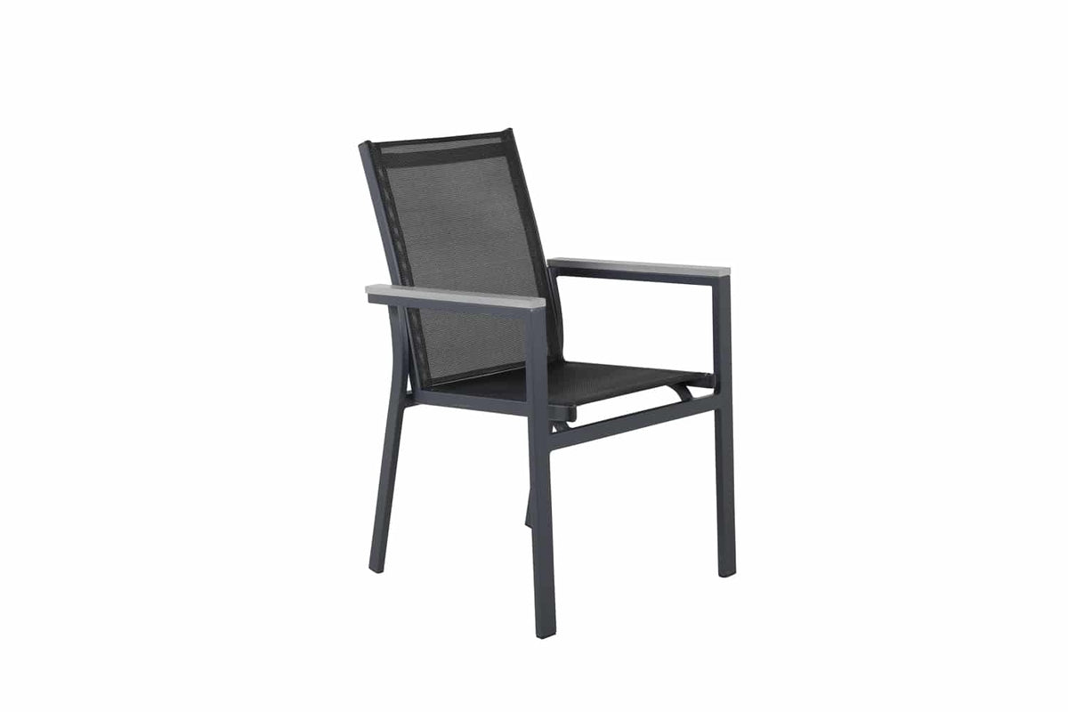 Parma är vår omtyckta karmstol i klassisk, industriell design och raka nordiska former. Den genomgående svarta kulören skapar en lyxig känsla och det slitstarka materialet aluminium och textilene ger dig en stol som står sig över tid. Stolen har armstöd i grå aintwood vilket blir till en smakfull detalj. Parma är också stapelbar vilket gör den smidig att förvara. Skötselråd: Textilene är ett syntetiskt tyg som är tillverkat av PVC-behandlad polyester. Materialet är vattenresistent och UV-behandlat för att motverka solens blekning. Rengöring bör göras ungefär en gång i månaden, använd en fuktig trasa och torka av.