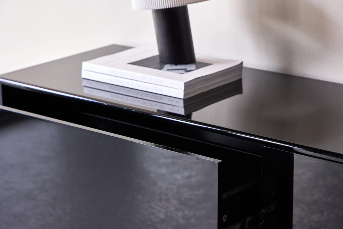 Ge ditt vardagsrum en modern och elegant touch med Fristad - en stilren TV-bänk designad för det medvetna hemmet. Tillverkad i robust MDF och klädd i en blank svart glossy ytbehandling, utstrålar Fristad en tidlös och sofistikerad känsla. TV-bänken är helt utan ben för ett minimalistiskt uttryck som smälter snyggt in i moderna interiörer. De två utdragbara lådorna erbjuder rymlig och praktisk förvaring för allt från fjärrkontroller till spelkonsoler och kablar - perfekt för att hålla ordning och skapa ett rent intryck.