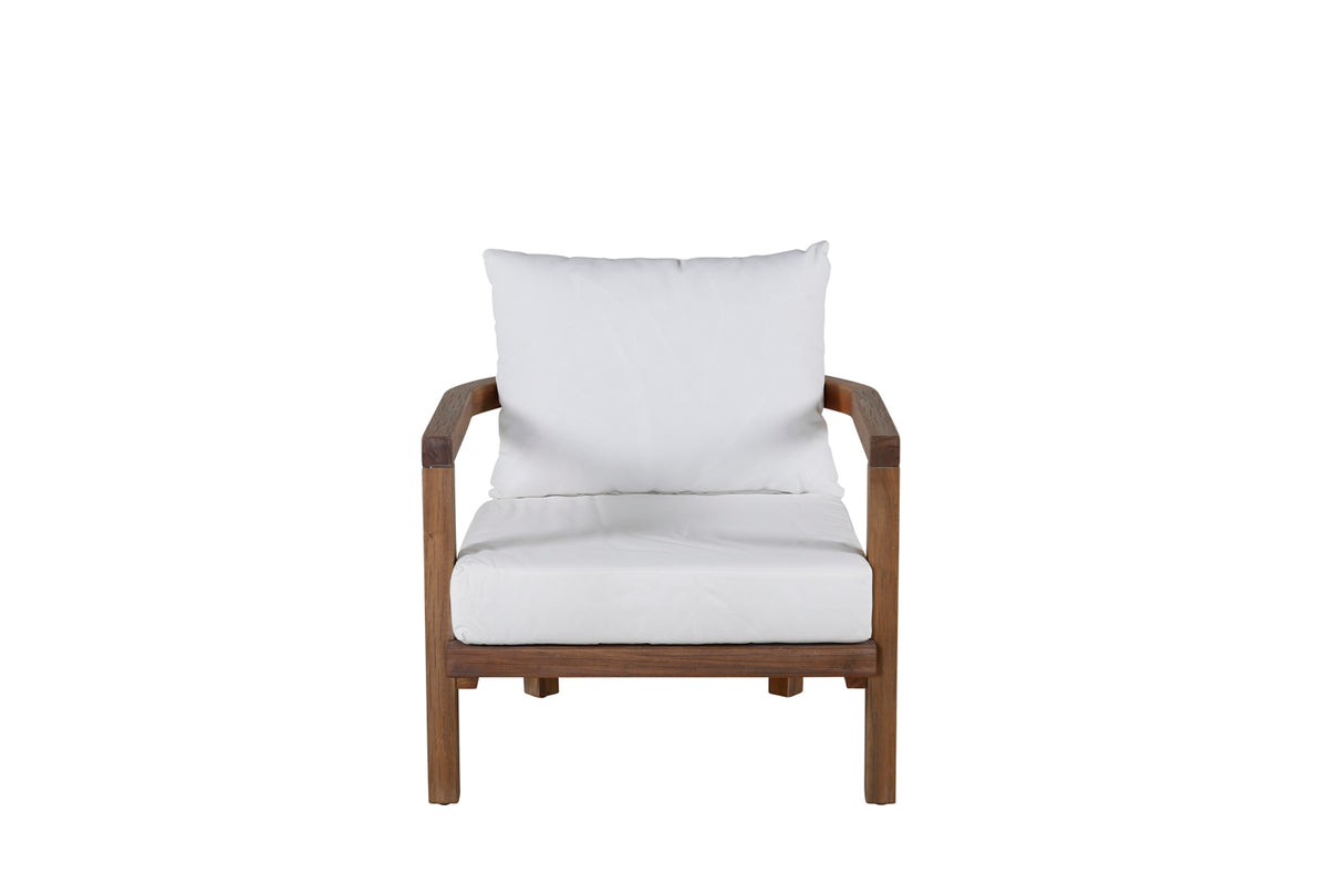 En drömstol till sommarens uteliv! En modern och stilren karmstol tillverkad i brun akacia med mjuka vita dynor till. Stolen har ett industriellt och rustikt uttryck vilket gör att den passar in i de flesta miljöer. Vår loungestol Erica passar in lika bra vid poolkanten som under paviljongen i trädgården. En bekväm och robust stol med alla rätt helt enkelt! Skötselråd: För att dina utemöbler i Akacia/hårdträ ska bibehålla sin finish bör de oljebehandlas. Eftersom träslagen i sig inte är lika feta av naturen behöver de oljas lite då och då, även under säsong. Nyinköpta möbler ska mättas med olja, applicera flera lager efter varandra så maximalt med olja absorberas.