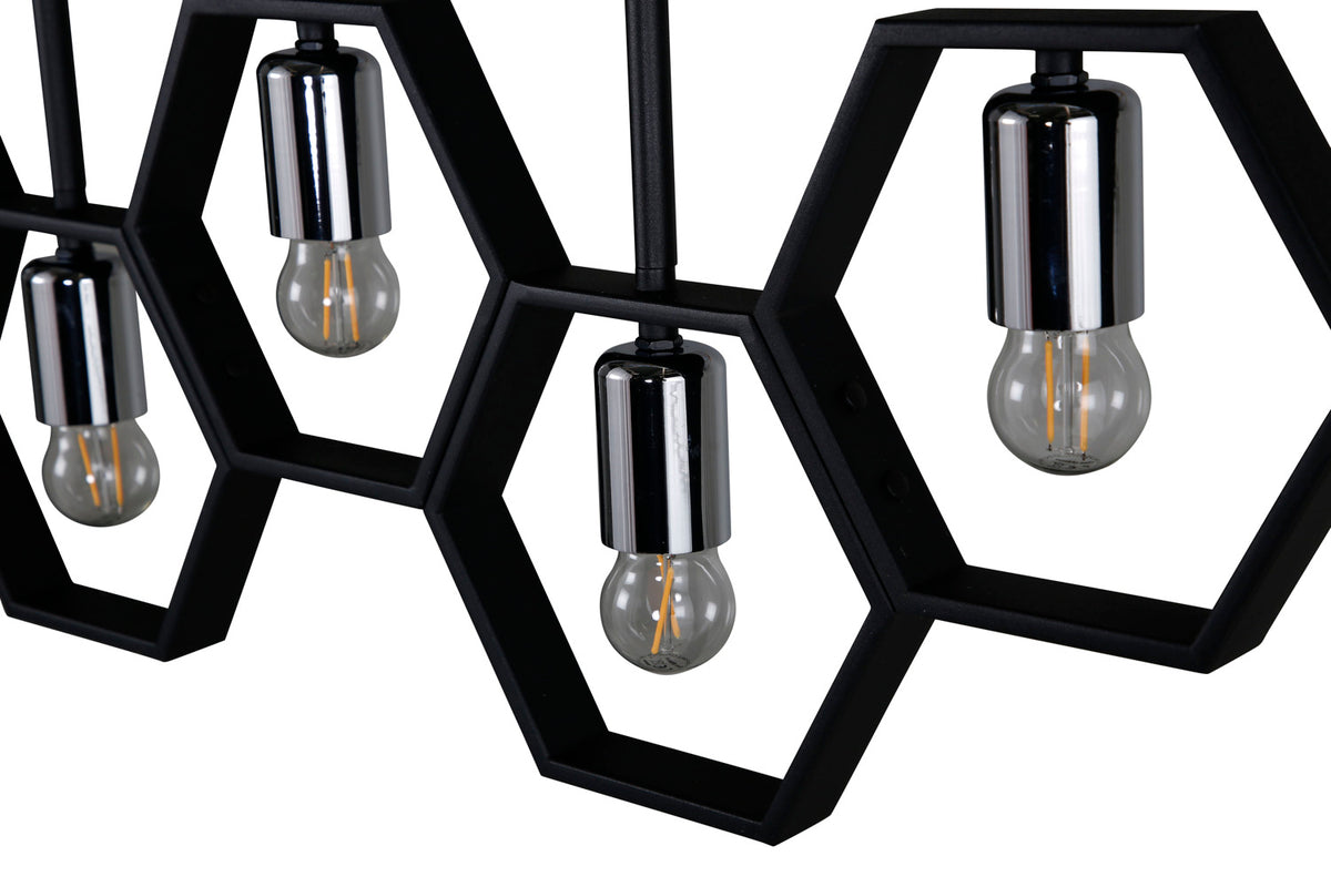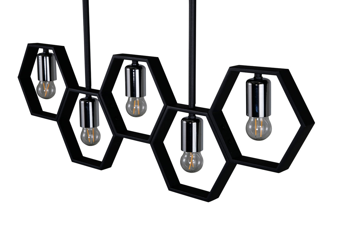 Med Queen B får du en unik och stilfull taklampa som sticker ut ur mängden! Lampan har en dekorativ ram som är tillverkad i svart stål och fyra mindre ljuskällor. Med den här lampan får du både ett behagligt sken och en vacker inredningsdetalj till hemmet. De stilrena färgerna gör att lampan enkelt matchar med övrig inredning, men den gör sig helt klart bäst över matbordet!
