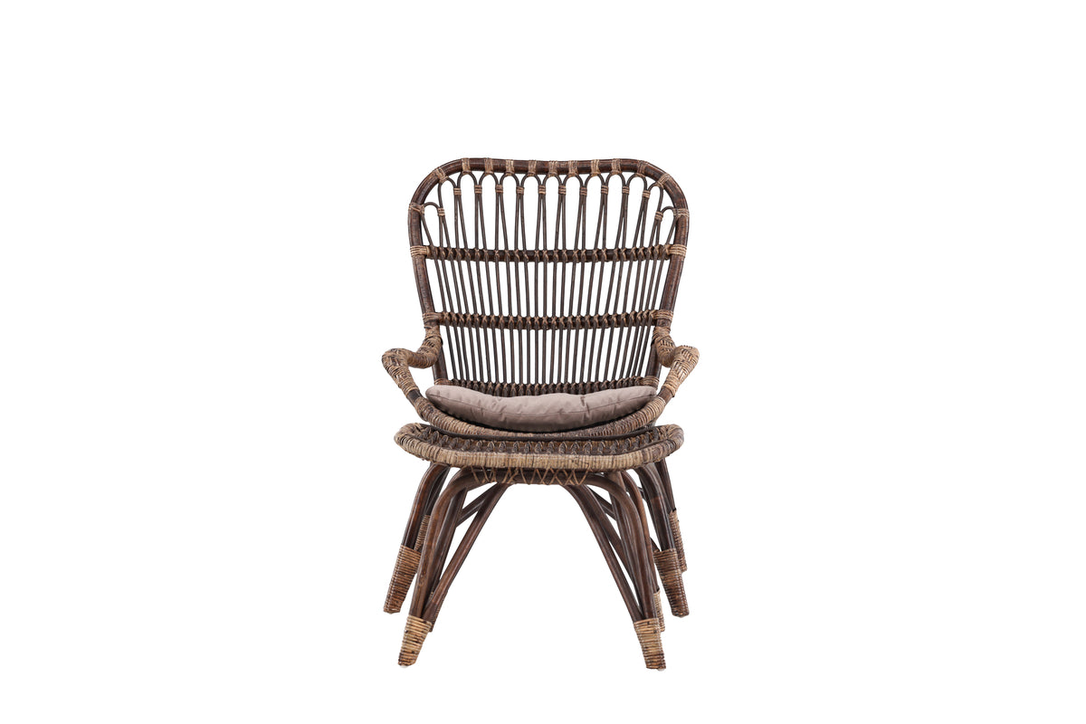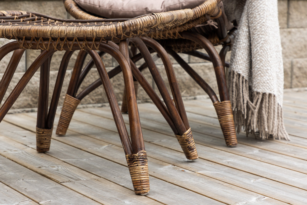 Stolen och fotpallen är vackert utförda i rotting med en djup mörk valnötsnyans, vilket ger ett varmt och sofistikerat uttryck. De mjuka dynorna i en lugnande beige ton skapar en harmonisk kontrast och erbjuder hög komfort i varje ögonblick.