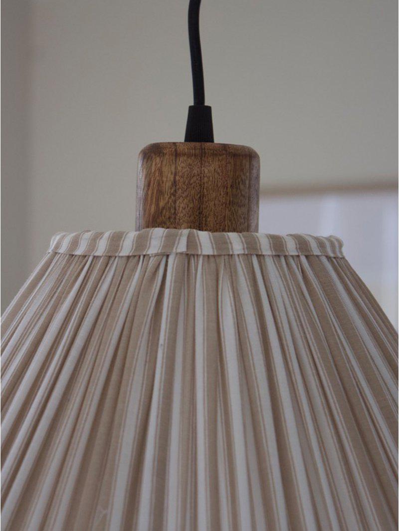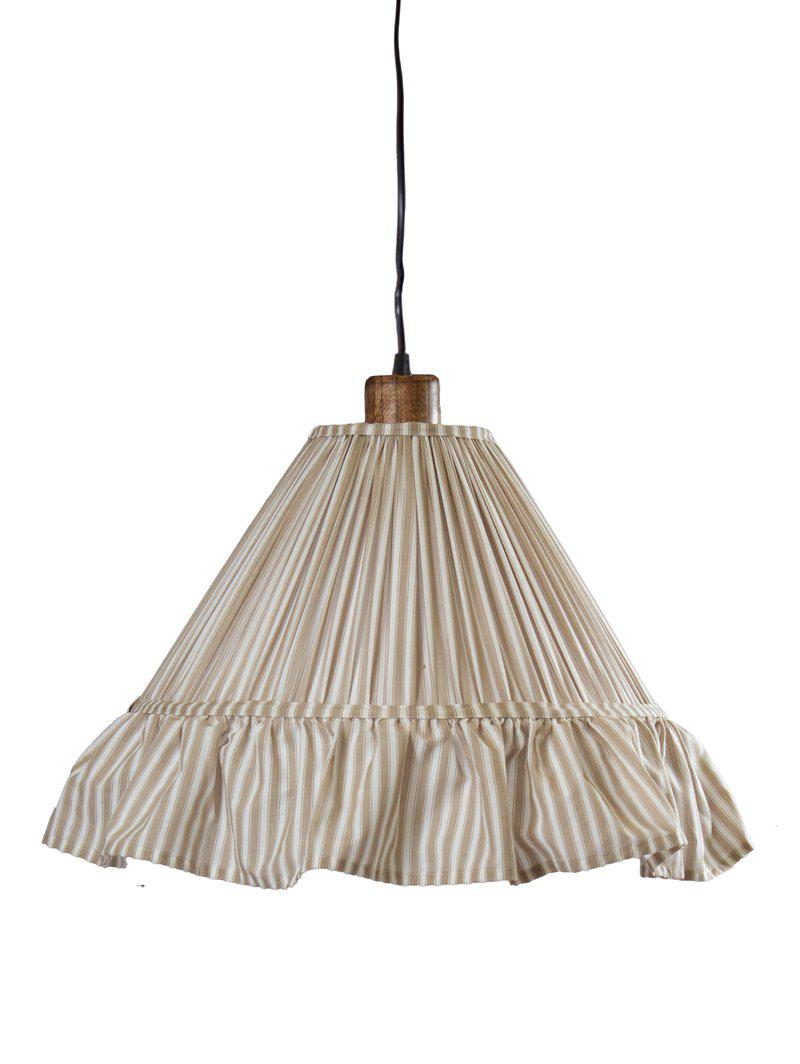 Taklampa Estrid med rynkat tyg och en rynkad kjol som är 15cm hög. Formen på skärmen är lätt konisk. Skärmens diameter nedtill är 40cm, 13cm upptill och den är totalt 22cm hög (exkl kjol). Skärmen har en E27 lamphållare. Vi rekommenderar att man använder en LED ljuskälla max 25W till denna takskärm. Takupphäng i mangoträd medföljer. Ljuskälla ingår ej.