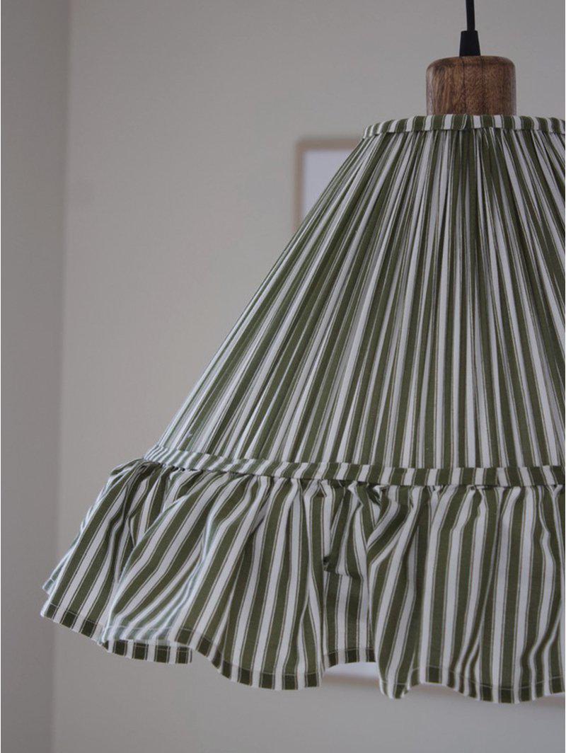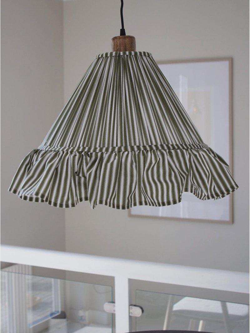 Taklampa Estrid med rynkat tyg och en rynkad kjol som är 15cm hög. Formen på skärmen är lätt konisk. Skärmens diameter nedtill är 40cm, 13cm upptill och den är totalt 22cm hög (exkl kjol). Skärmen har en E27 lamphållare. Vi rekommenderar att man använder en LED ljuskälla max 25W till denna takskärm. Takupphäng i mangoträd medföljer. Ljuskälla ingår ej.
