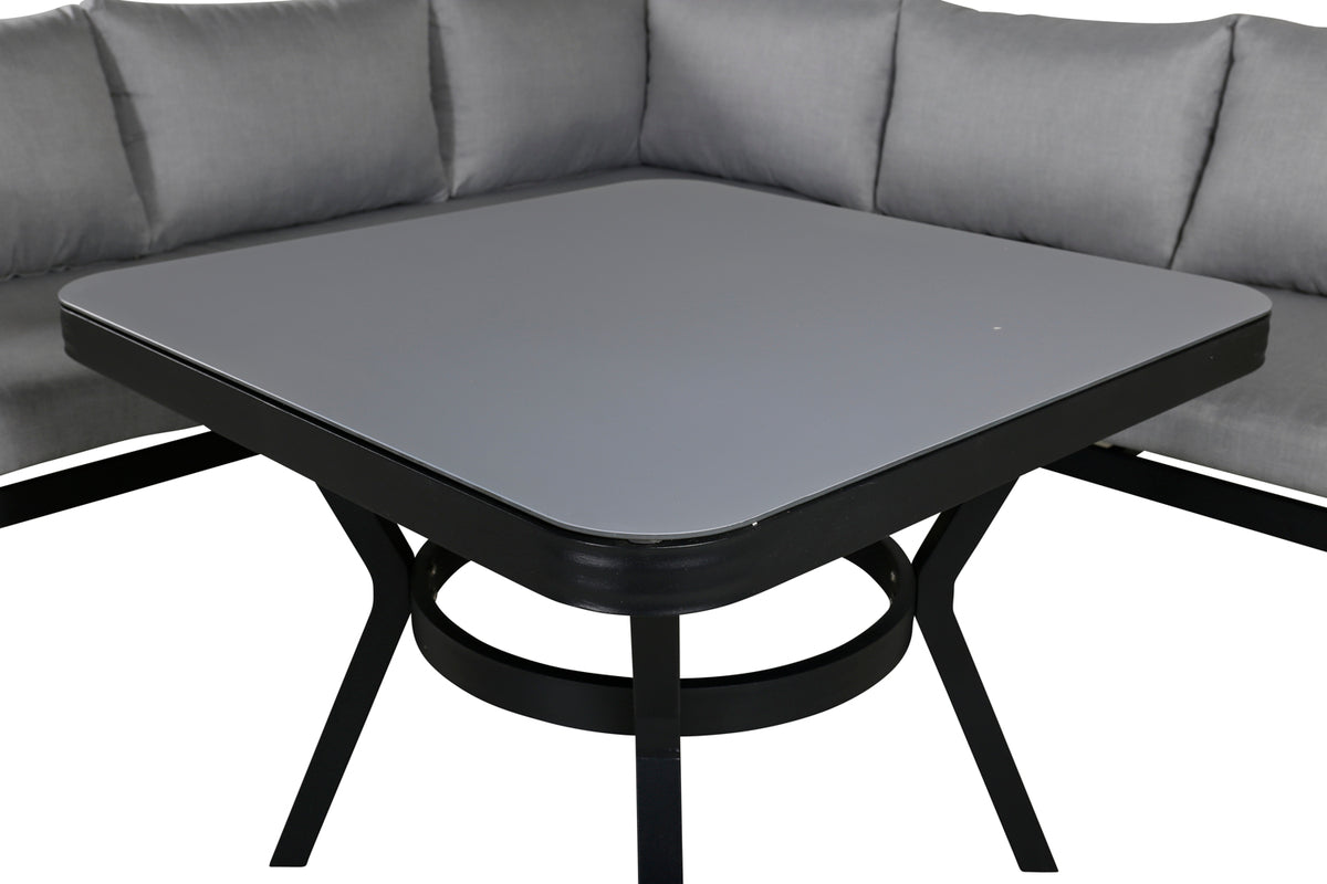 Virya är en modern soffgrupp, med inriktning på komfort och design som garanterat kommer göra succé på uteplatsen i sommar! Möbelgruppen består av en hörnsoffa tillverkad i en slitstark design i svart pulverlackerad metall med en rygg som är designad i ljusgrått rep, samt ett rektangulärt högt soffbord med en bordsskiva i grå finish som matchar repen och dynornas nyans och skapar en exklusiv helhet. Mjuka, ljusgrå dynor ingår till soffgruppen!