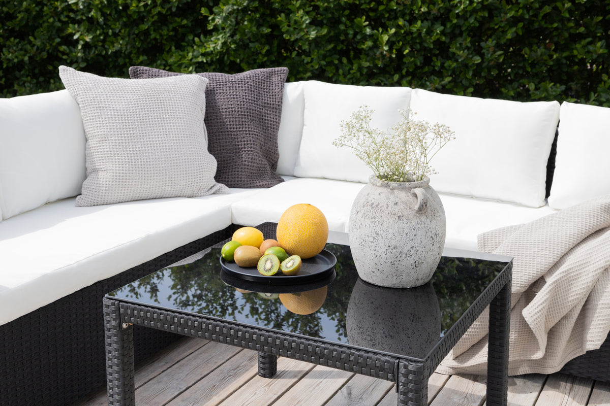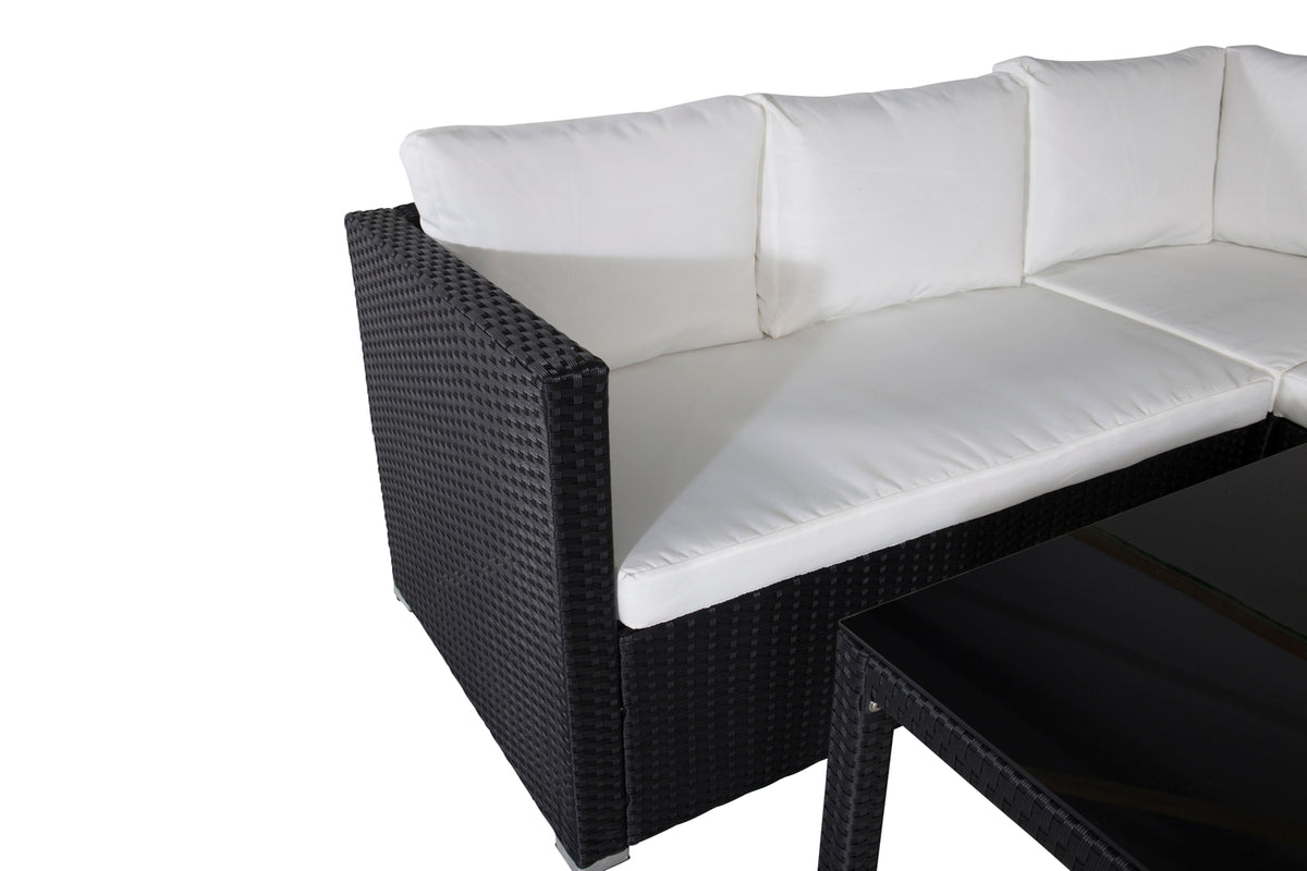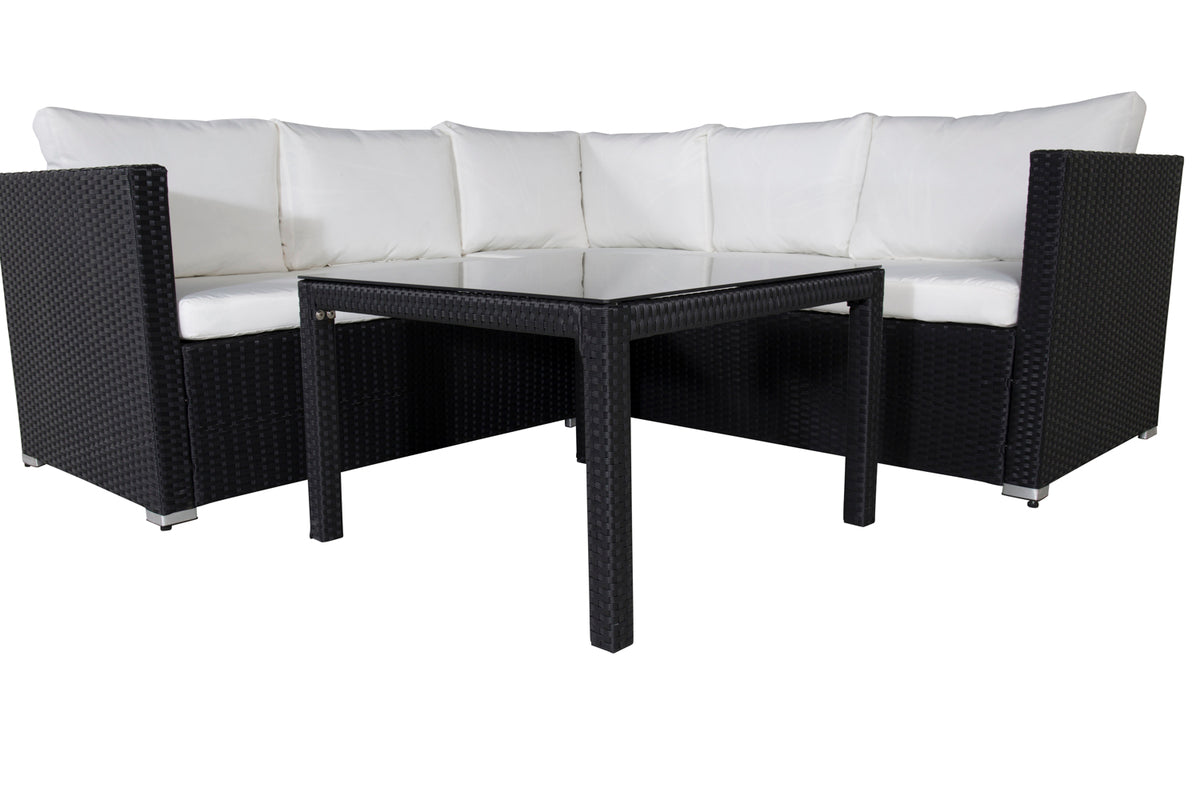 Kuba, en modern loungegrupp i svart konstrotting av hög kvalité som garanterat kommer göra succé till uteplatsen eller altanen i sommar. Loungegruppen består av en hörnsoffa som är i modulform, så det går att kombinera den på flera olika sätt, här med 4 sittplatser och ett hörn. Inklusive vita mjuka dynor samt ett rektangulärt soffbord med en bordsskiva i svart glas. Mått: 180x180 cm. Lättare montering krävs. Här kan du och dina gäster sitta bekvämt och njuta av sena sommarkvällar!