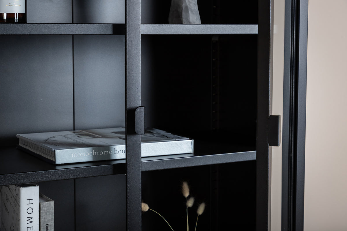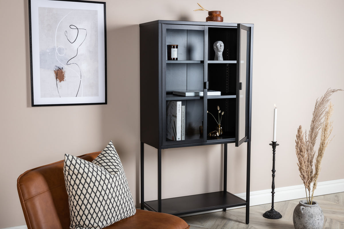En elegant förvaringsmöbel med praktisk och stilren design! Misha, i modern nordisk design med raka strukturer är tillverkad i pulverlackerad svart stål med två glasdörrar för härligt ljusinsläpp. Skåpet har en ståtlig höjd som öppnar upp rummet och skapar en trendig atmosfär. Detta vitrinskåp är användbart för mycket. Det finns tre hyllplan för avlastning som du kan fylla efter egna behov och önskemål - vackert porslin, böcker eller stilrena inredningsdetaljer - valet är ditt! Lättare montering krävs.