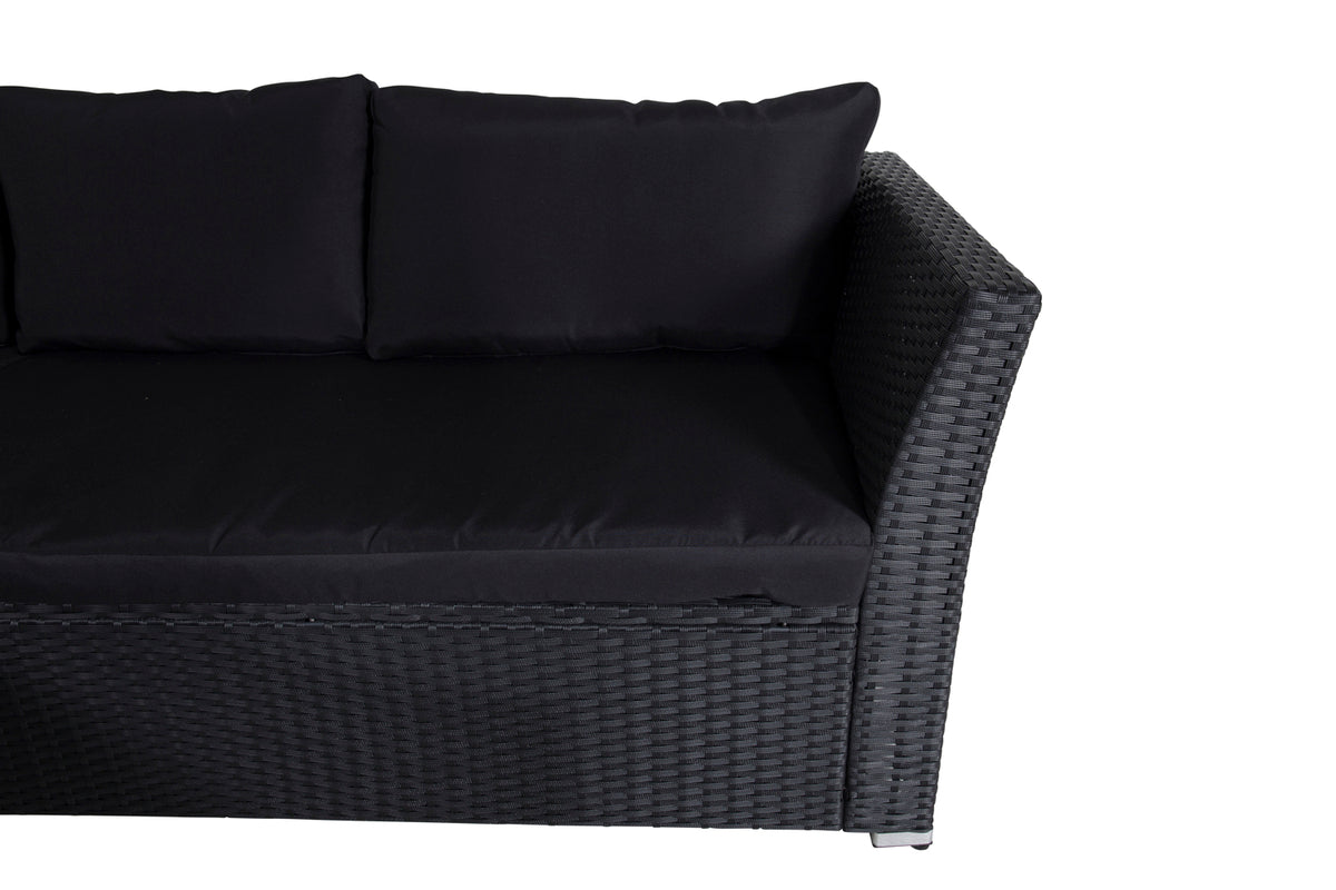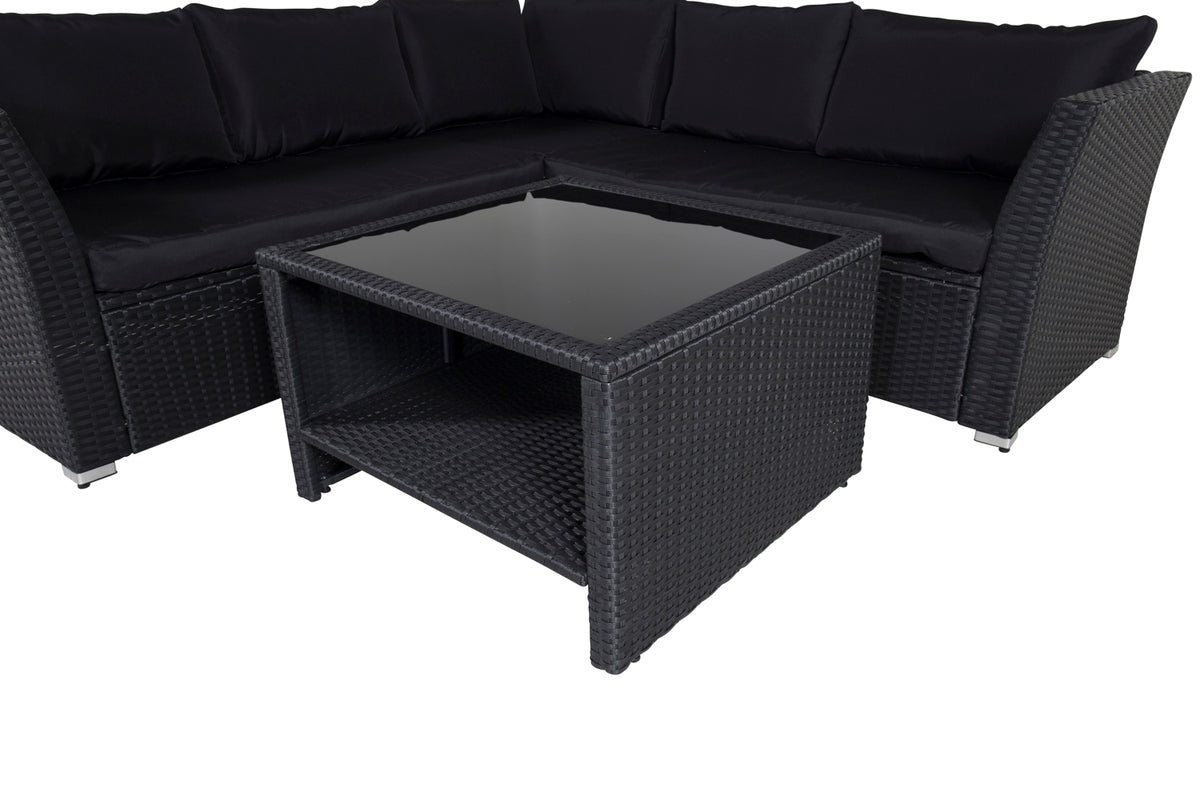 Modern loungegrupp i svart konstrotting av hög kvalité till uteplatsen eller altanen. Loungegruppen består av en hörnsoffa som är modulbaserad, så det går att placera den på flera olika sätt, med 4 sittplatser och ett hörn. Inklusive svarta mjuka dynor samt ett rektangulärt soffbord med en en avlastningshylla och en bordsskiva av svart glas. Mått: 194x194 cm. Lättare montering krävs.