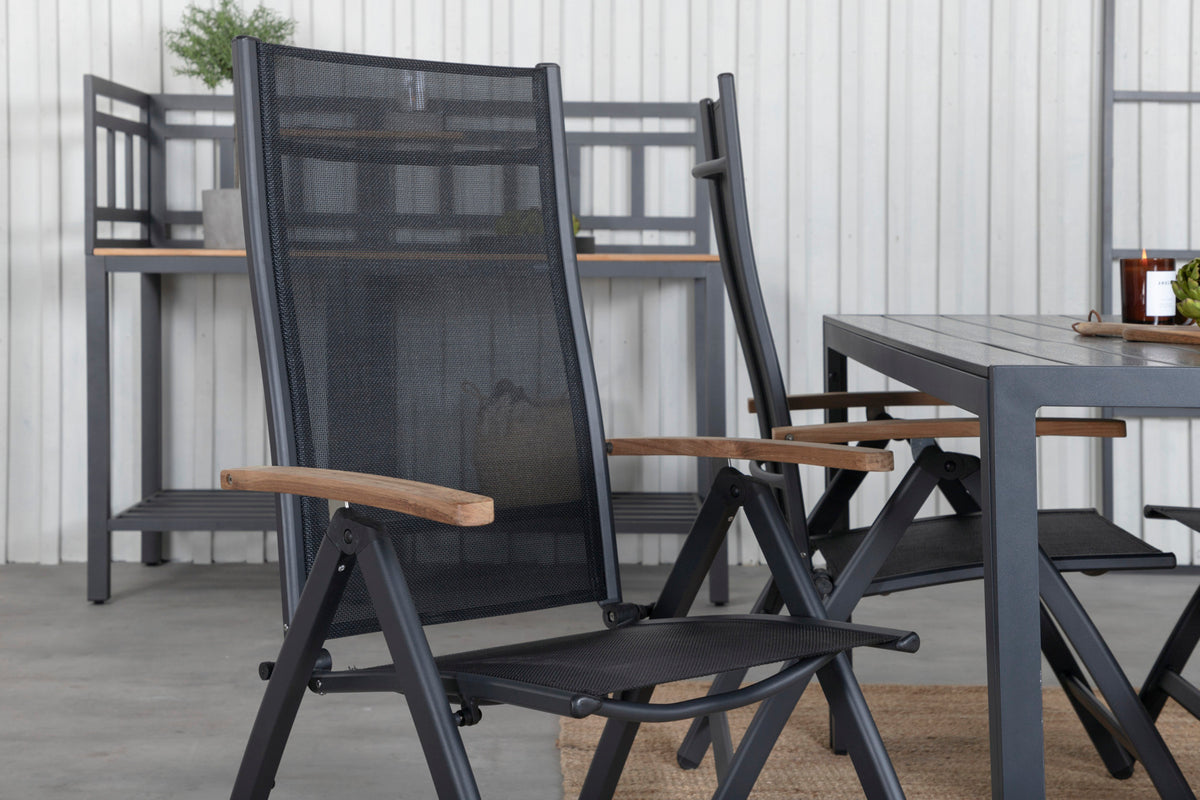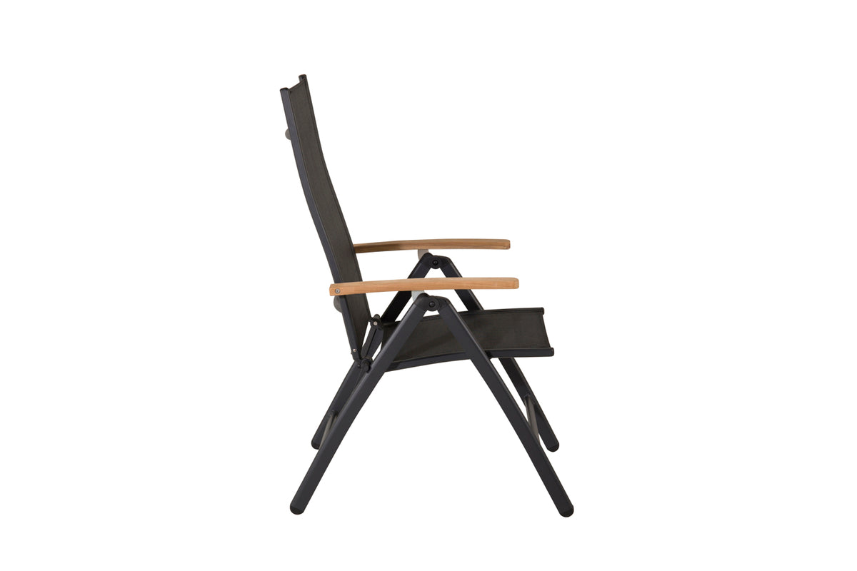 Panama, en svart fällbar matstol anpassad för utomhusbruk. Med smakfulla armstöd i teak får stolen ett pampigt uttryck, vilket faller många i smaken. Stolen funkar lika bra till moderna som klassiska matbord. Justera ryggstödet för optimal komfort och njut av många härliga sommardagar tillsammans!