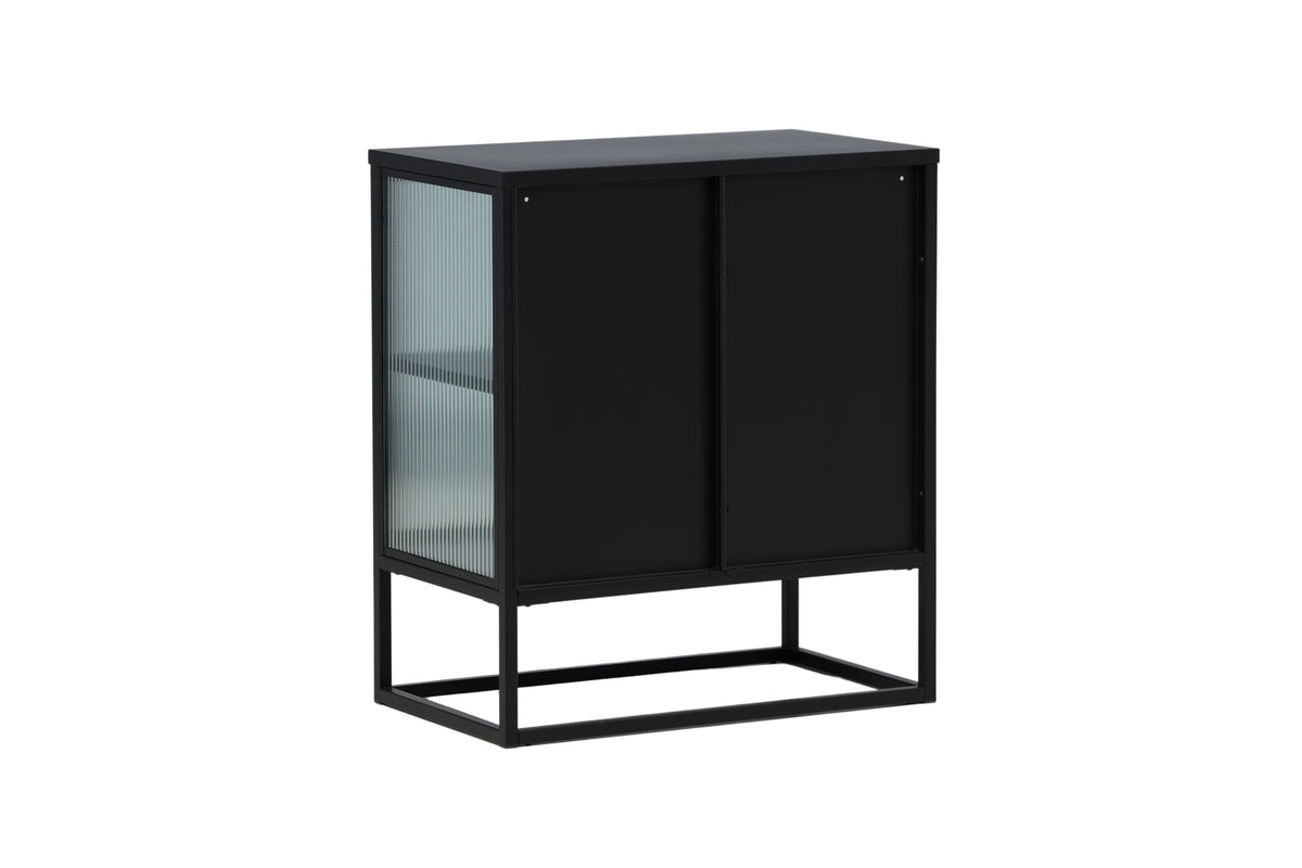 Välkommen till en värld av sofistikerad förvaring med vårt trendsäkra förvaringsskåp från serien Garis. Detta svarta skåp med glasdörrar i skandinavisk design kombinerar estetik med funktion. De två glasdörrarna har en veckad design och skåpet ramas in av en stilren ram i svart pulverlackerat metall, vilket gör detta skåp till en tidlös investering i din inredning. Garis har också ett öga för detaljer. De mässingsfärgade handtagen blir pricken över i:et och den stålramen som bär upp skåpet skapar en luftighet som inte bara är snäll mot dammsugaren utan också ger din möbel ett schysst lyft till en mer öppen atmosfär i rummet. Skåpet har två smarta hyllplan innanför glasdörrarna som rymmer plats för allt du önskar förvara på ett organiserat sätt. Här kan du placera ditt finaste porslin och dekorera med vackra ljus, böcker och vaser för att ombona ditt hem lite extra. Låt detta skåp bli en del av ditt dagliga liv och ge ditt hem en touch av raffinerad förfining!