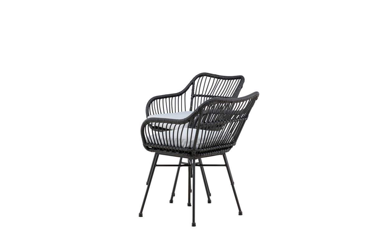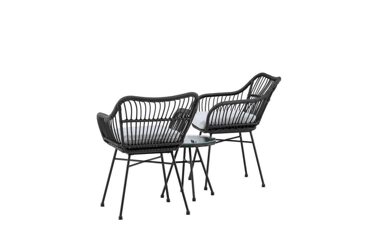 Viga, vårt stilrena balkongset i modern design som passar perfekt på den inglasade uteplatsen. Möbelgruppen består av två karmfåtöljer med en svart ramställning i pulverlackerad metall samt rygg och sits designat i ett stilrent nätt mönster av svart naturrotting. Inklusive vita dynor och ett soffbord med detaljer i svart naturrotting och en bordsskiva av glas. Möblera uteplatsen med ett balkongset som garanterat kommer förlänga de sena sommarkvällarna tillsammans med nära och kära! Skötselråd: Ett naturmaterial som är otrolig snyggt och trendigt, däremot inte särskilt väderbeständigt. Rottingmöbler ska helst inte stå utomhus utan bör placeras i torra utrymmen. Undvik stora temperaturskillnader. Enklaste rengöringen sker med fuktig trasa.