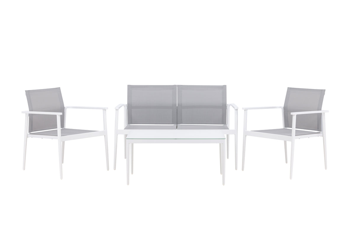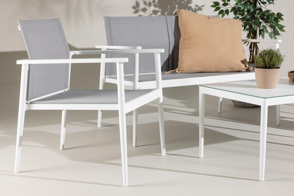 Skapa din favorithörna på uteplatsen med en snygg soffgrupp från serien Break! Designen är genomtänkt med fokus på komfort och stil. Den vita ramen har en rak nordisk form och är tillverkad av aluminium. Rygg och sits är inbjudande med hög sittkomfort tillverkat av grå textilene. Följ våra skötselråd så får du en bekväm soffgrupp att njuta av med familj och vänner och som står sig över tid! Skötselråd: Våra möbler i textilene kombineras vanligtvis med teak eller aluminium. Textilene är ett syntetiskt tyg som är tillverkat av PVC-behandlad polyester. Materialet är vattenresistent och UV-behandlat för att motverka solens blekning.