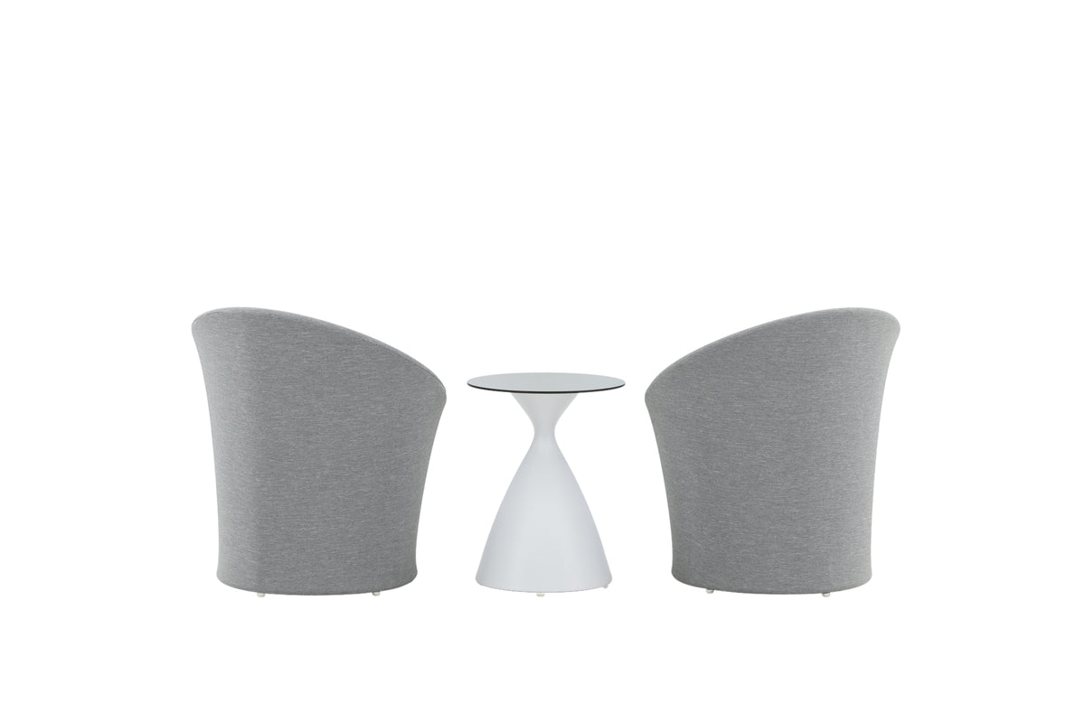 Detta nätta loungeset i vitt och grått kommer med två bekväma stolar med tillhörande dynor och ett lätt bord som du enkelt förflyttar. Den tidlösa designen gör att det är kompatibelt i många miljöer och passar lika bra på den stora terassen som den lilla uteplatsen. Ett mysigt loungeset där du kan njuta av en kopp kaffe en varm morgon i solen!