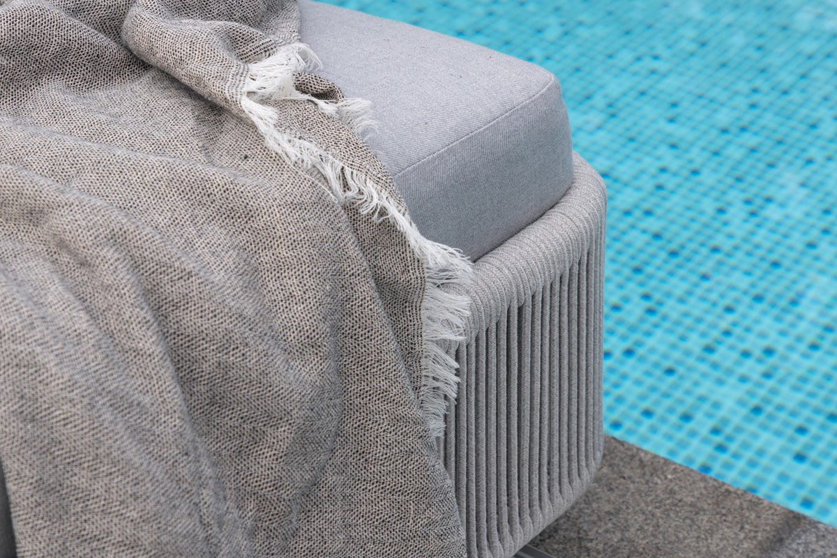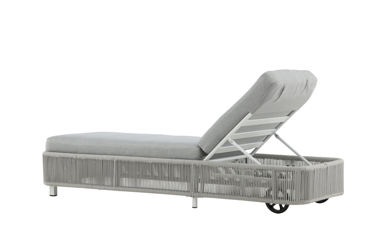 En klassisk solsäng gjord av gråa rep med tillhörande gråa dynor. Placera precis där du själv vill, flyttas enkelt med hjälp av hjulet. Njut här en varm sommardag i solen!