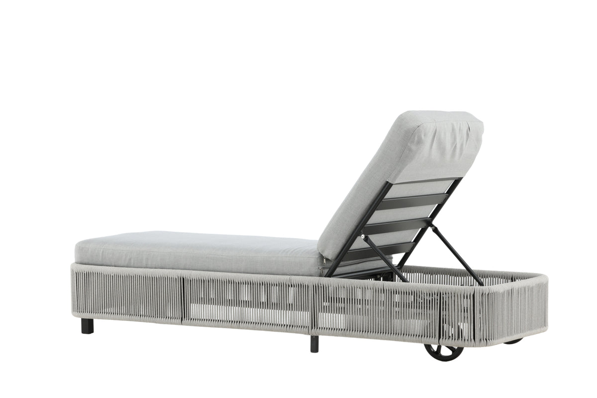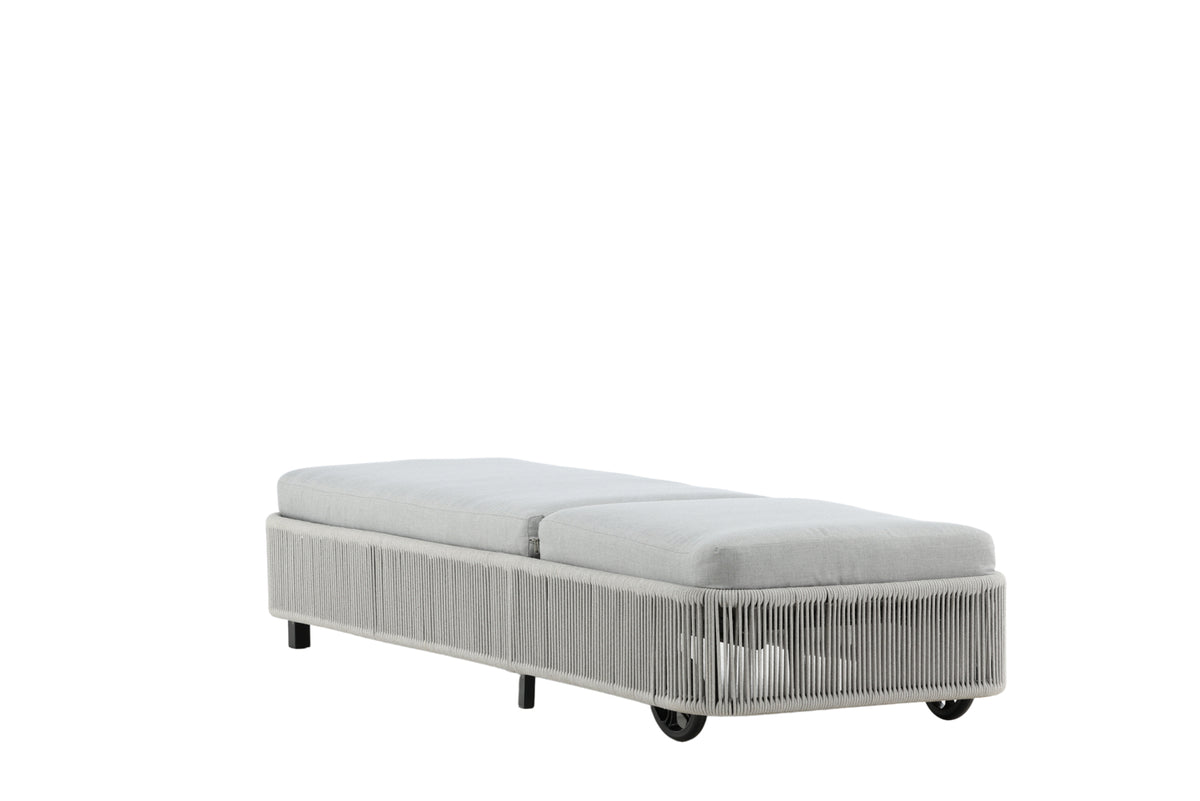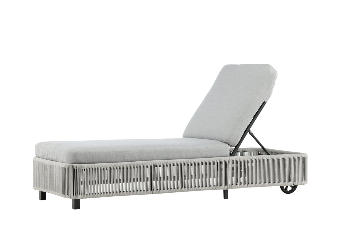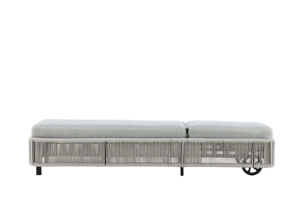En klassisk solsäng gjord av gråa rep med tillhörande dynor. Placera precis där du själv vill, flyttas enkelt med hjälp av hjulet. Njut här en varm sommardag i solen!