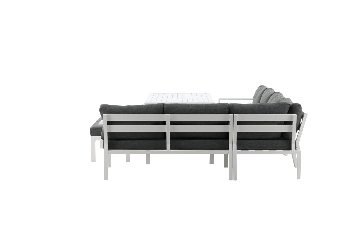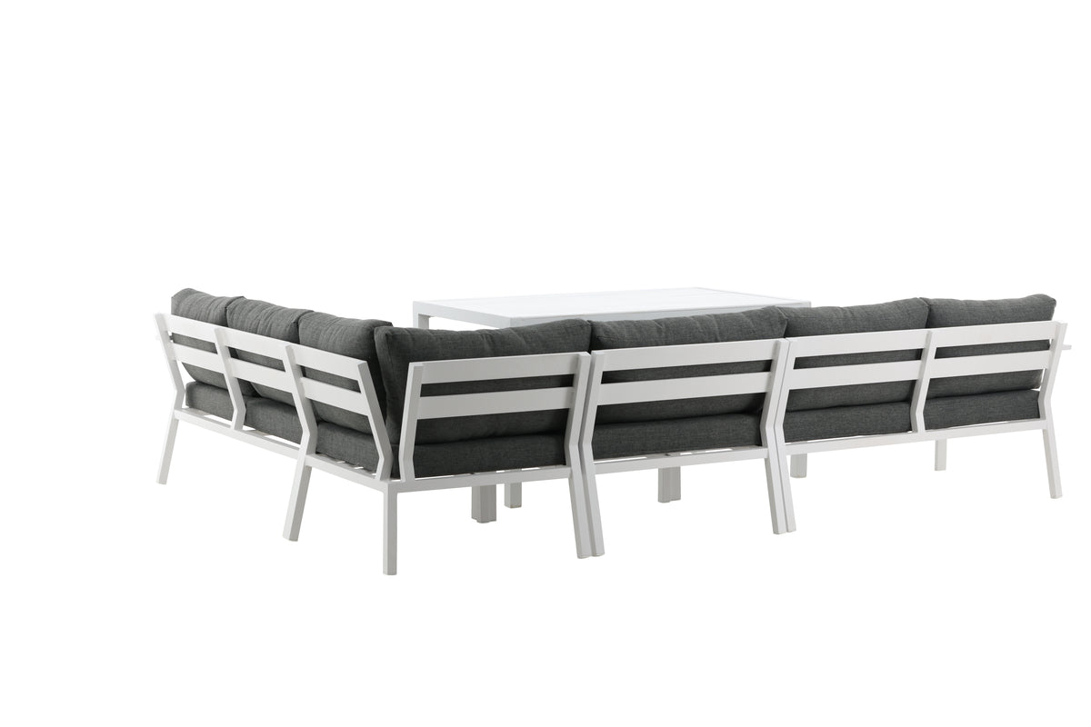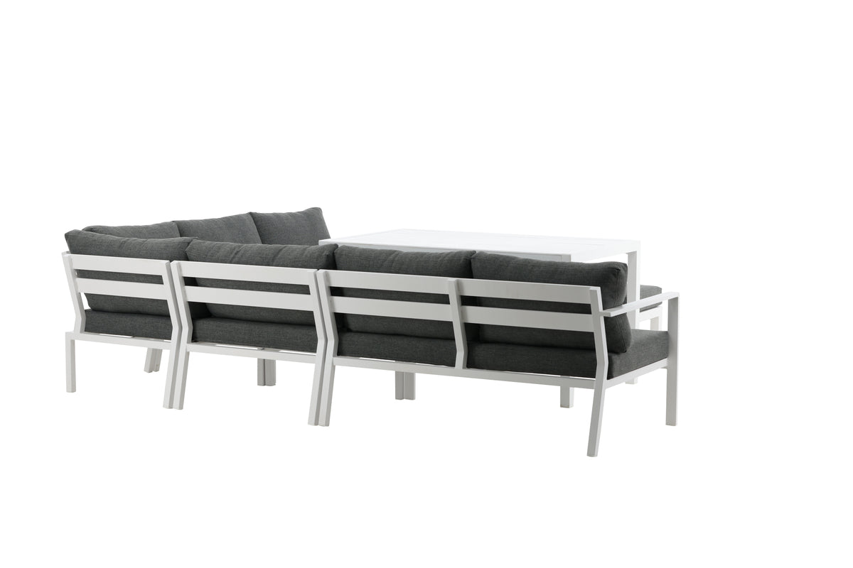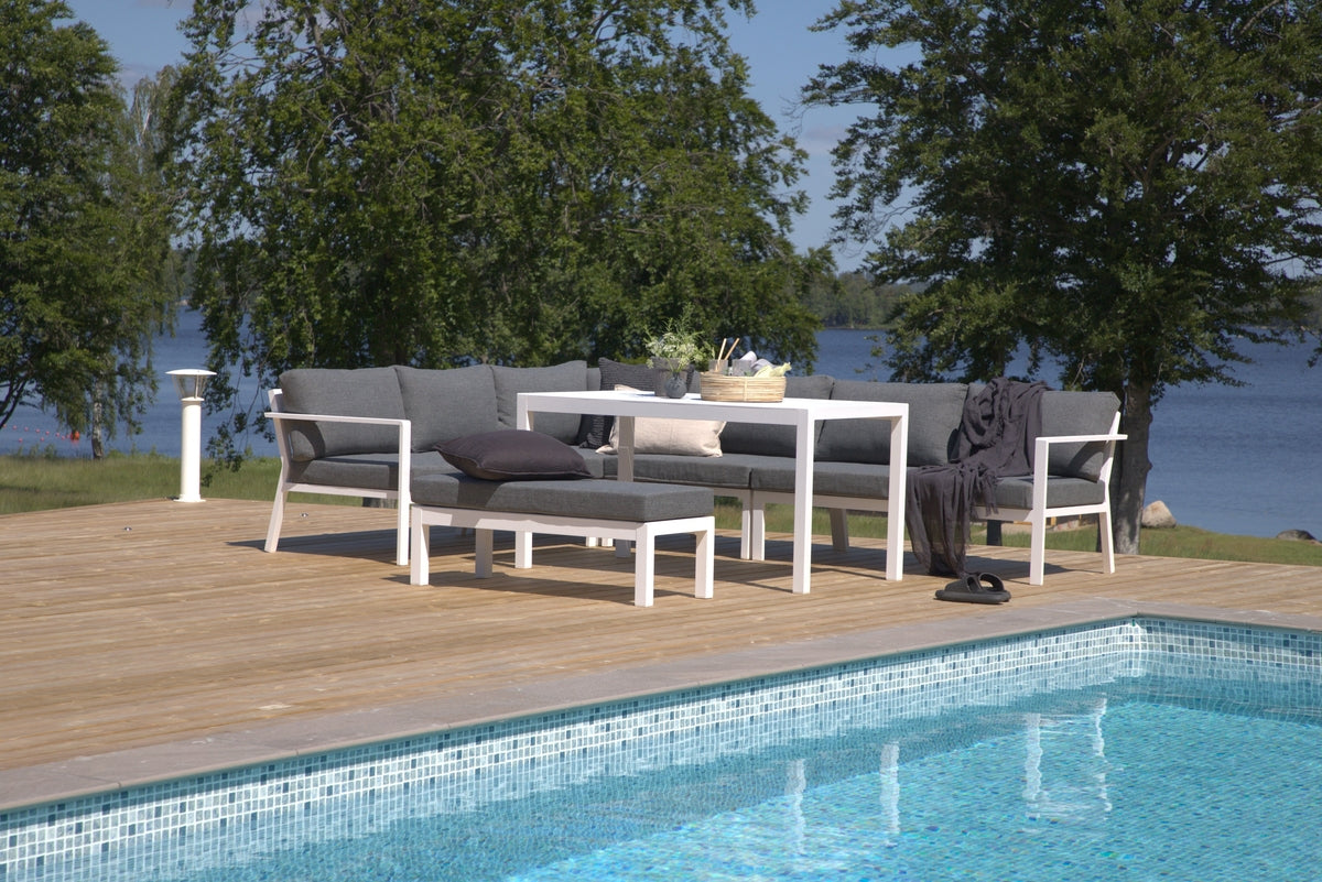 Ramos hörngrupp fungerar utmärkt för er som umgås många och har en större altan eller uteplats! Med sin tidlösa design och tåliga material är det en möbel som fungerar under många år. Perfekt för en fika eller varför inte läsa en bok i solen? Stommen är i vitlackerad aluminium och med dynor i grått.