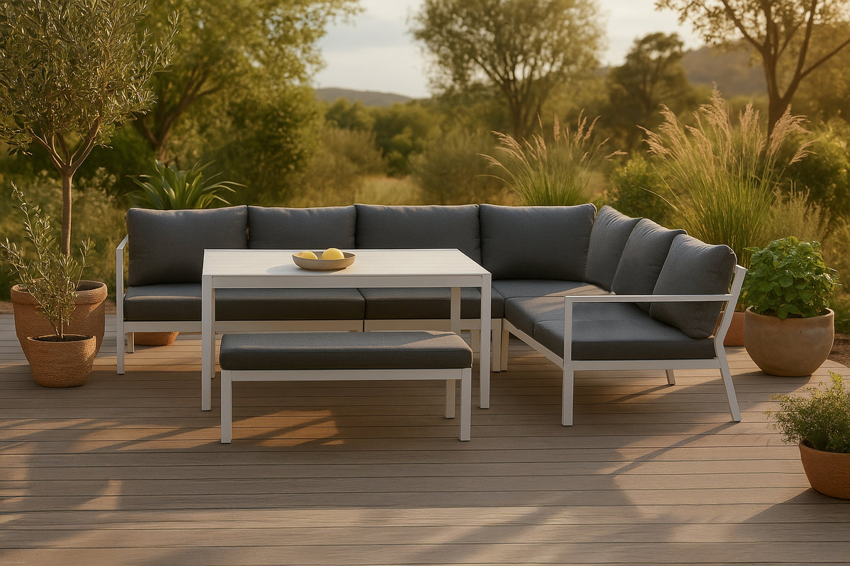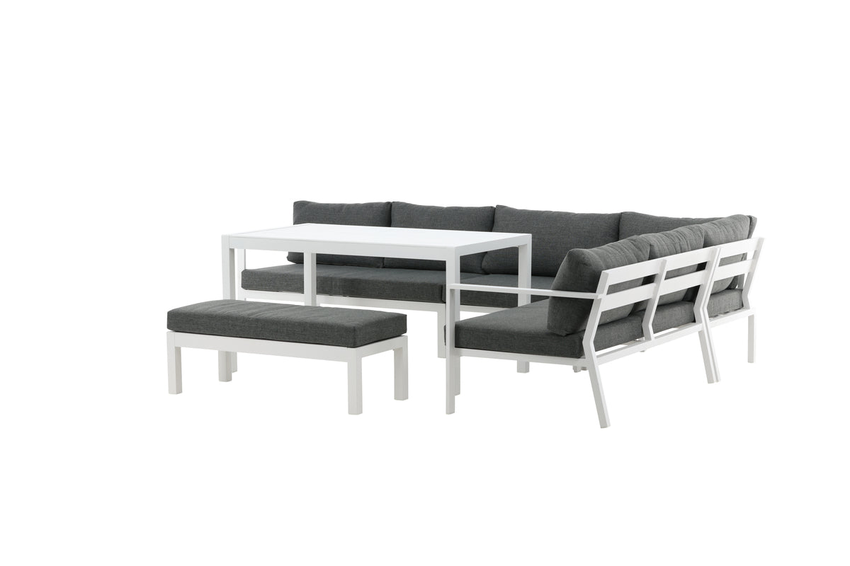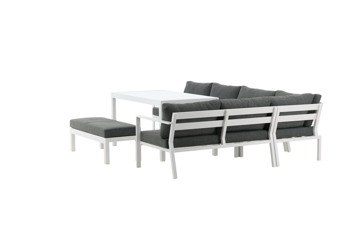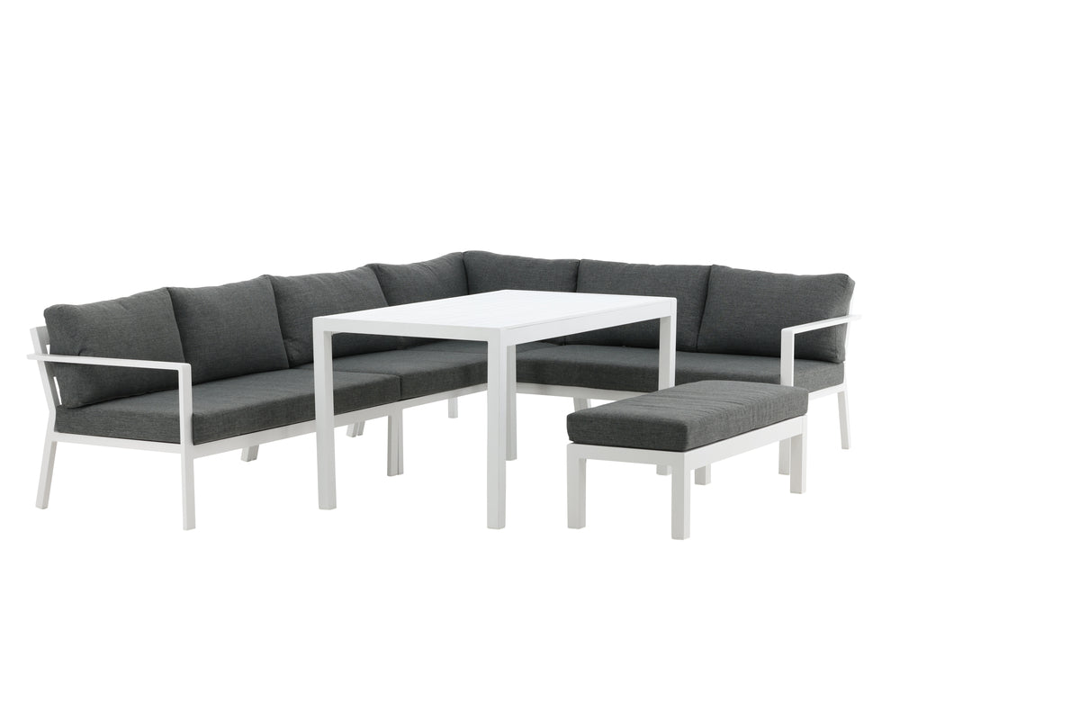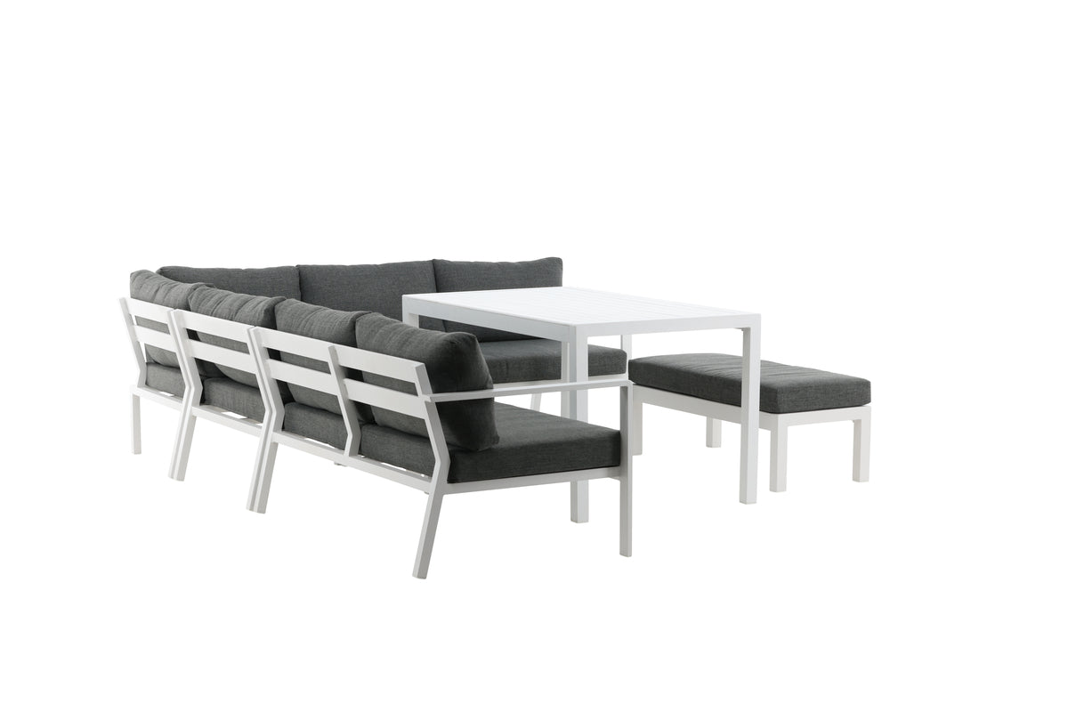 Ramos hörngrupp fungerar utmärkt för er som umgås många och har en större altan eller uteplats! Med sin tidlösa design och tåliga material är det en möbel som fungerar under många år. Perfekt för en fika eller varför inte läsa en bok i solen? Stommen är i vitlackerad aluminium och med dynor i grått.