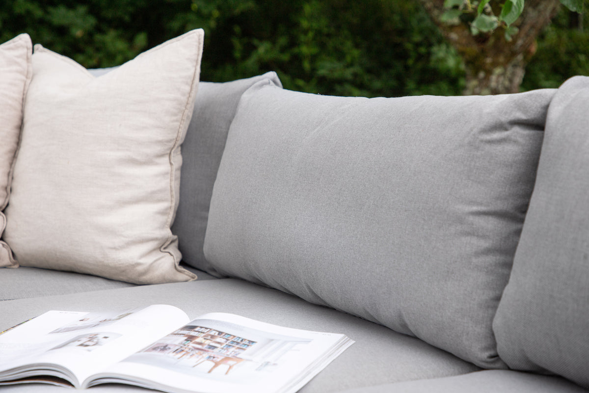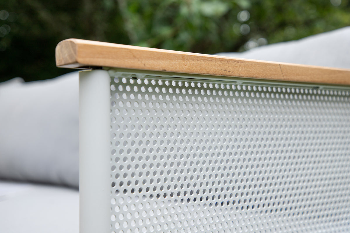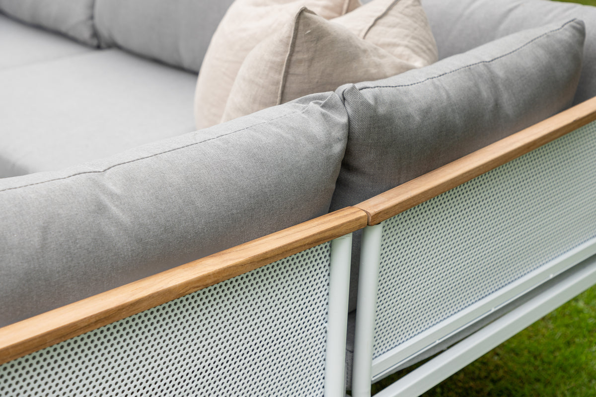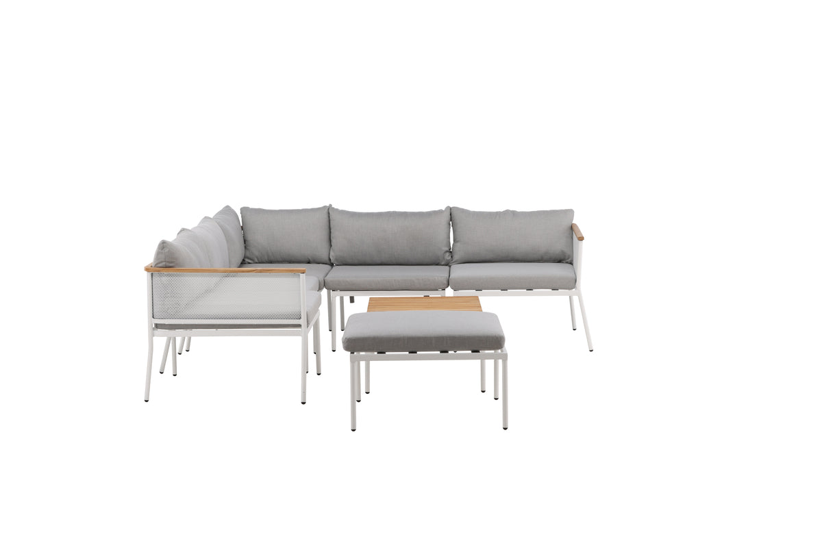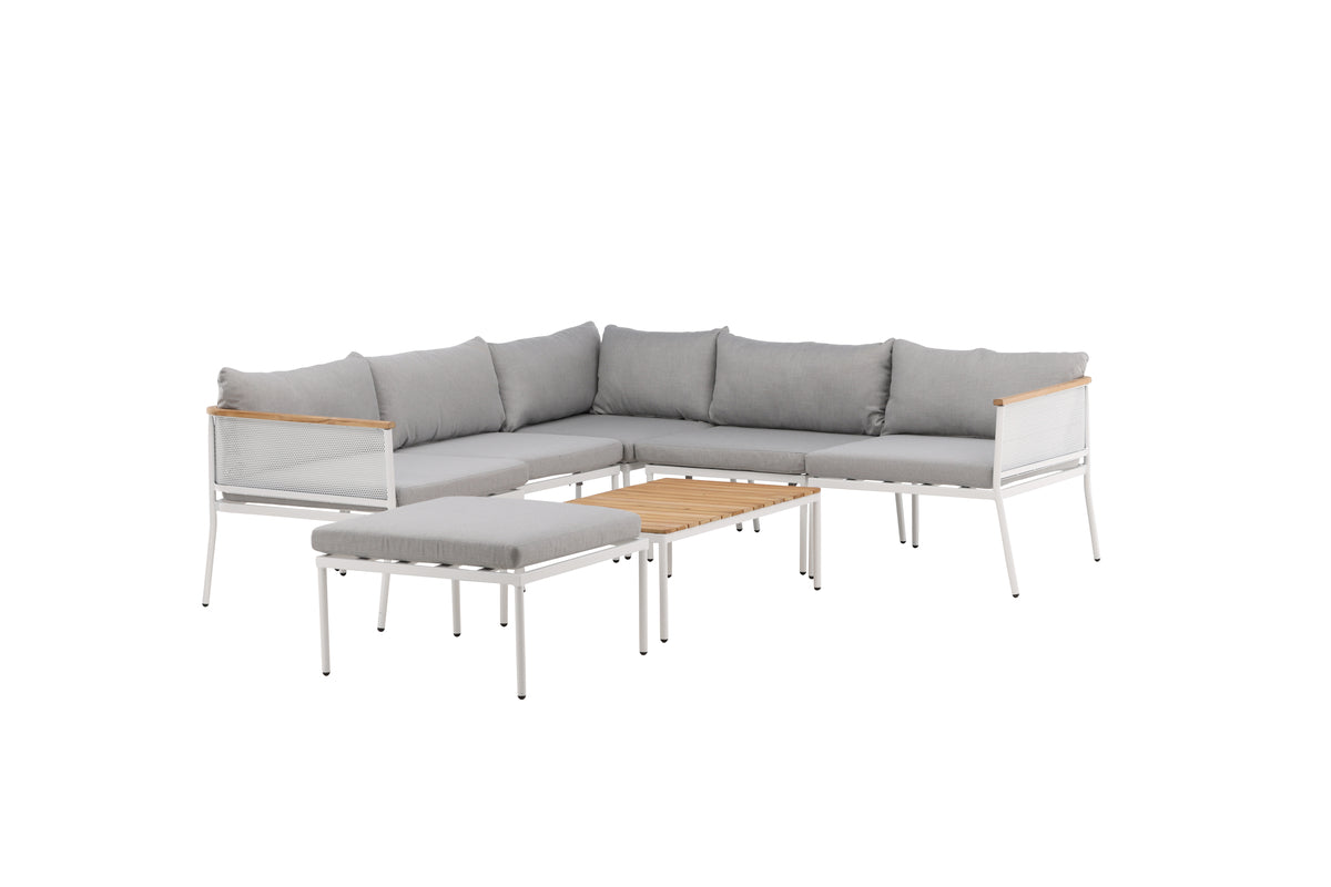 Nettan - den perfekta soffgruppen i modern och stilren design till din uteplats eller altan! Soffgruppen består av en hörnsoffa som är modulbaserad, så det går att placera den på flera olika sätt precis som du vill ha den med 3 sittplatser och en hörndel. Tillverkad i vit pulverlackerad metall och detaljer i vit metallnät och teak inklusive mjuka grå dynor samt ett rektangulärt soffbord med en bordsskiva i teak. Lättare montering krävs. Här slår du dig gärna ner tillsammans med nära och kära under sena sommarkvällar!