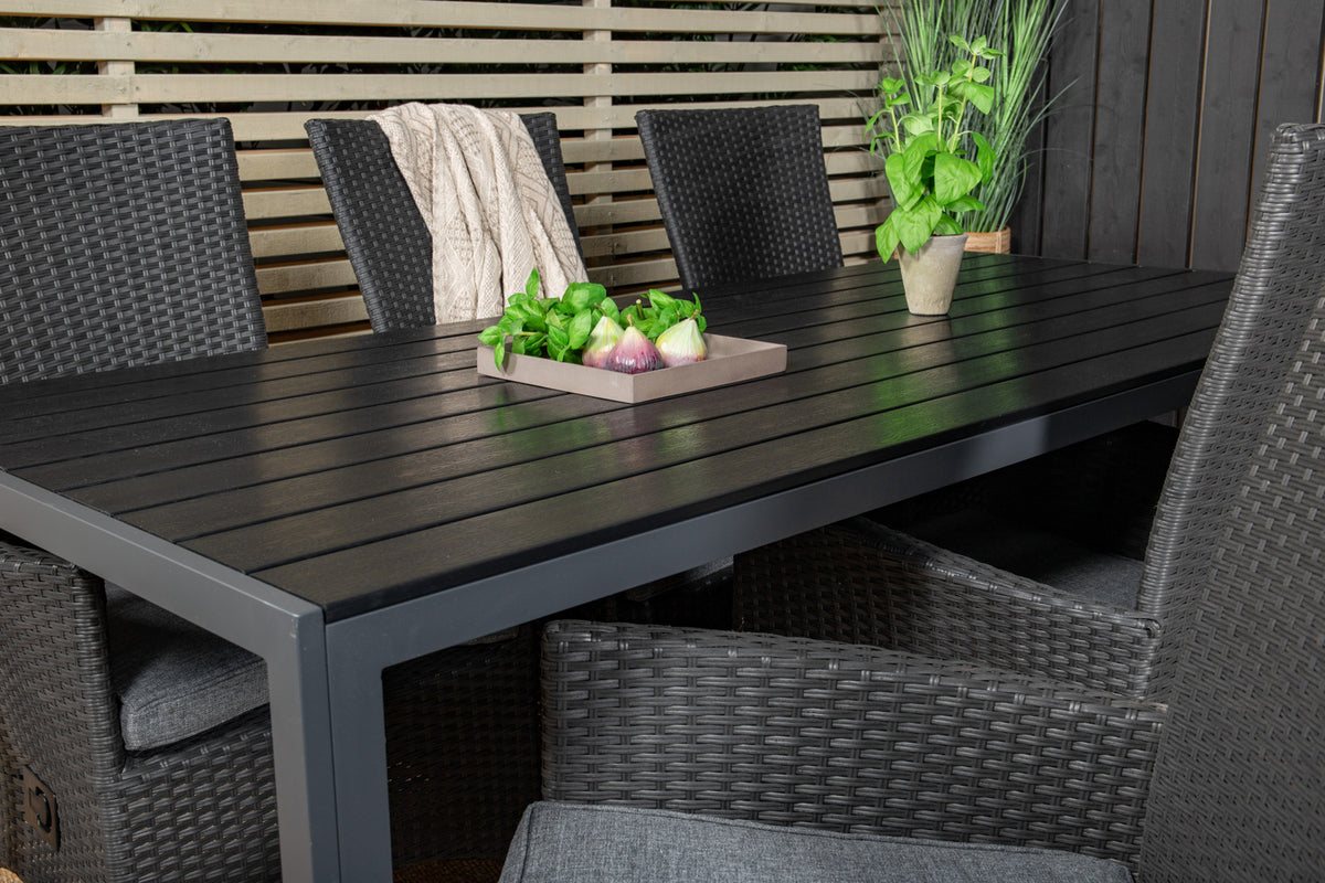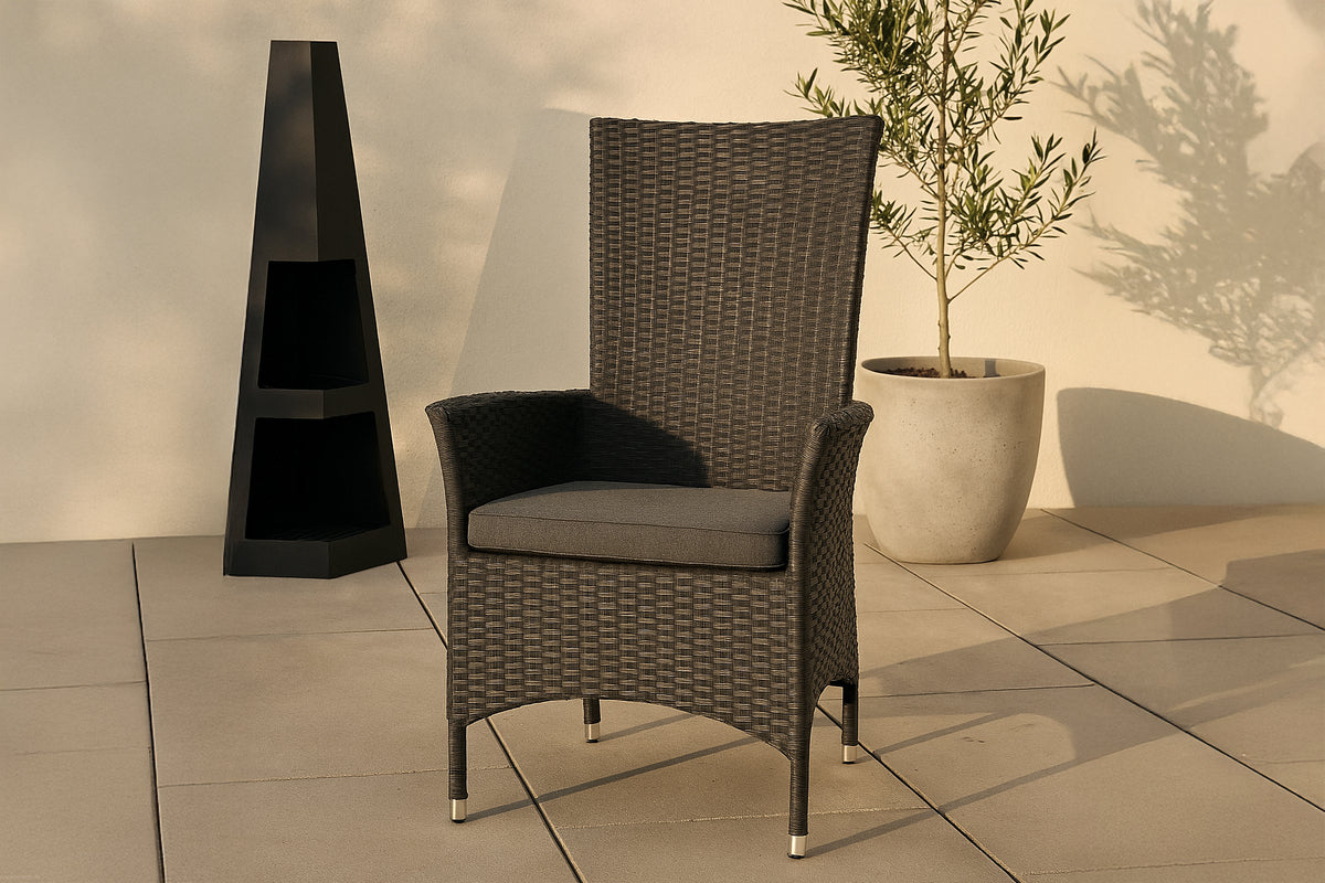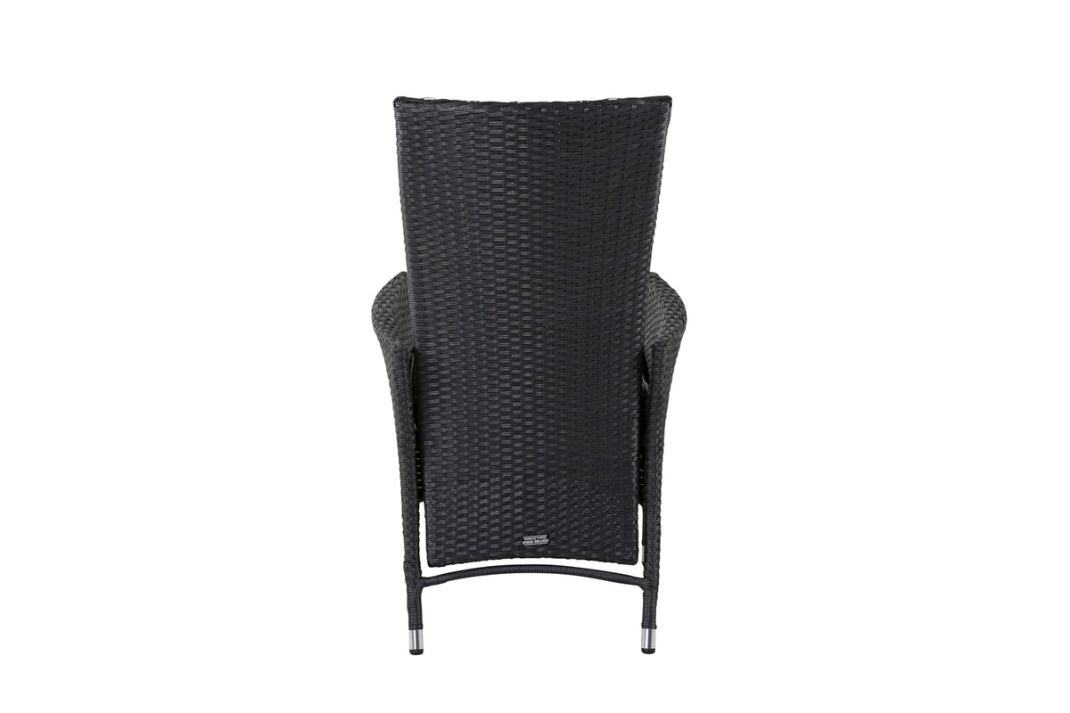 Sitt bekvämt i sommar i en modern matstol med fällbart ryggstöd för optimal komfort! Padova kommer i en kaxig svart kulör som är lika tidlös som stilren. Stommen är i aluminium och stolen i svart konstrotting. Möblera uteplatsen med en bekväm och robust stol som står sig över tid. Skötselråd: Konstrotting är ett plastmaterial som passar alldeles utmärkt för vårt skandinaviska klimat. Materialet är UV-beständigt och tåler väder och vind. Att det är UV-beständigt gör att möblerna inte bleknas, däremot rekommenderar vi alltid att förvara möblerna under ett möbelskydd eller på annat vis torrt och svalt – för att förlänga livslängden.