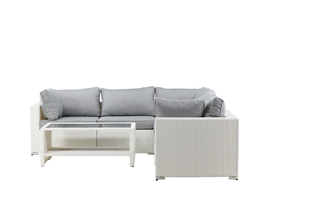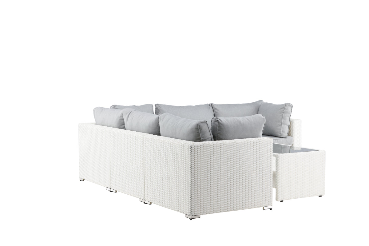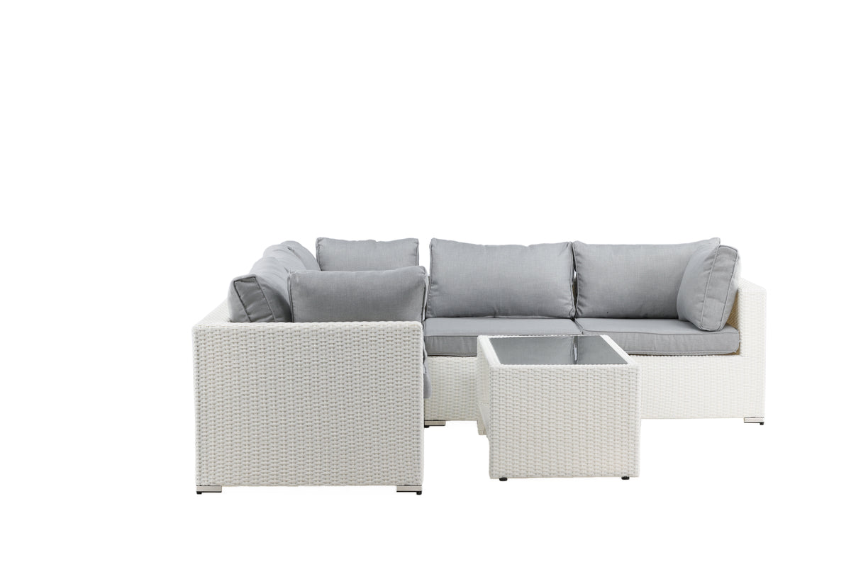 Amazon Soffgrupp imponerar med sin moderna design som har fokus på en god komfort till din uteplats eller altan. Soffgruppen består av en hörnsoffa i modulform med fyra sittplatser och en hörndel som går lätt att bygga ihop för att passa dina behov. Mjuka mörkgrå mjuka dynor inkluderas samt ett matchande, lägre soffbord med en bordsskiva av glas. Tillverkat av en metallstomme och vit konstrotting - två slitstarka material som lämpar sig utmärkt för utomhusbruk! Gör er redo för ett enastående uteliv i sommar.