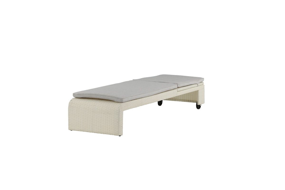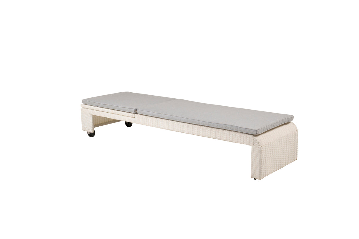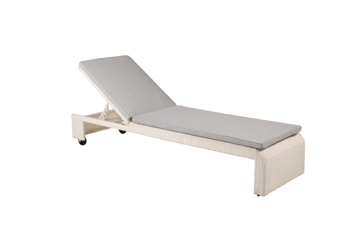 Modern, stilren och pampig solsäng från serien London skapar ett trivsamt blickfång på din uteplats. Här får du en krämvit solsäng med grå dyna, hjul och justerbart ryggstöd för optimala vilopositionen. Solsängen är tillverkad av svart konstrotting vilket gör den slitstark i utomhusmiljö. Här kan du njuta länge av lediga stunder på sommarens soliga dagar!