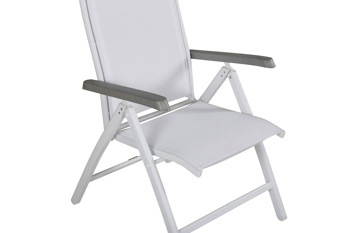 Albany - lika bekväm som praktisk och stilren! En vit 5-positionsstol med läckra armstöd för extra komfort. Stolen gör sig lika bra i trädgården som ute på altanen. Njut av sommaren på allra bästa sätt!
