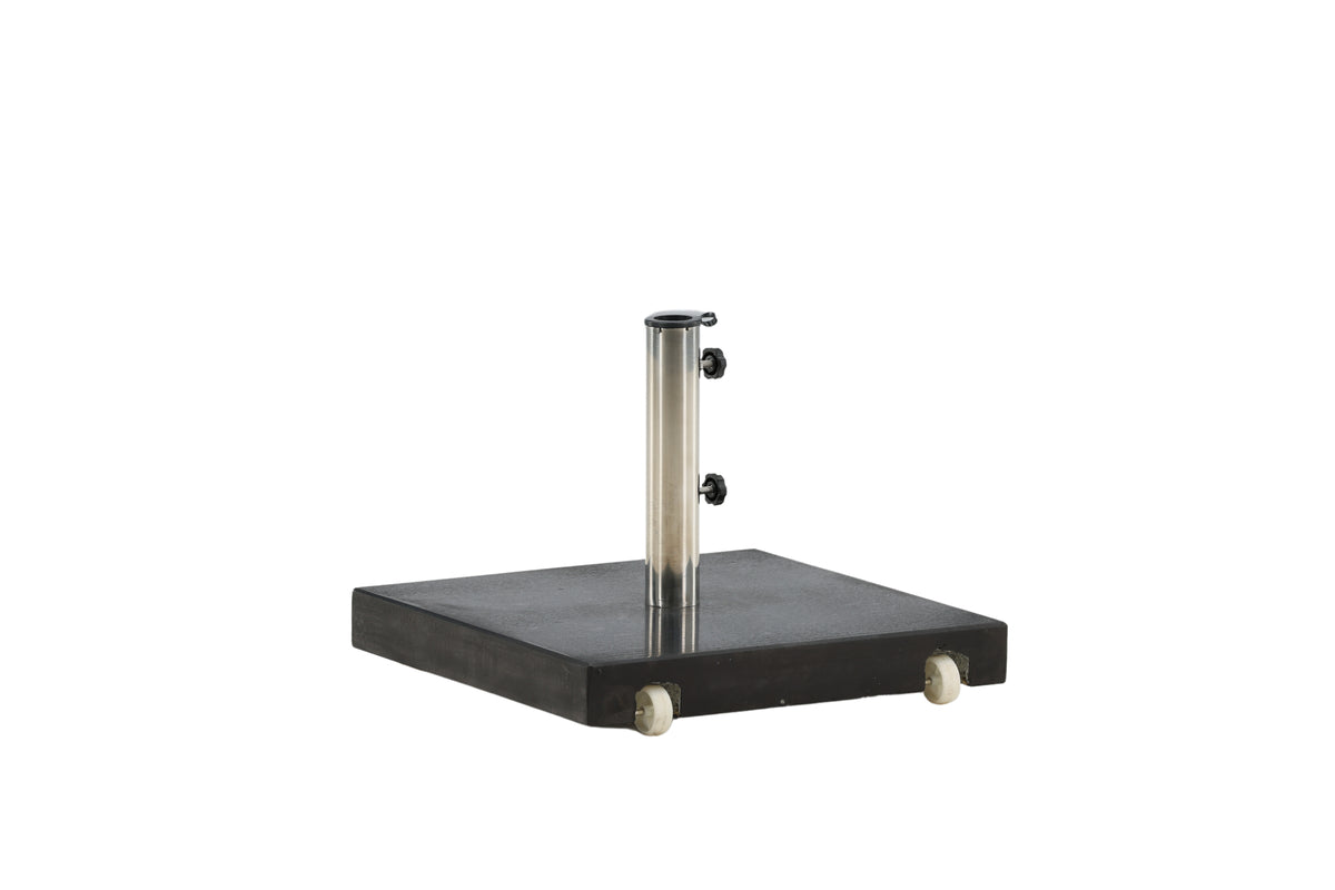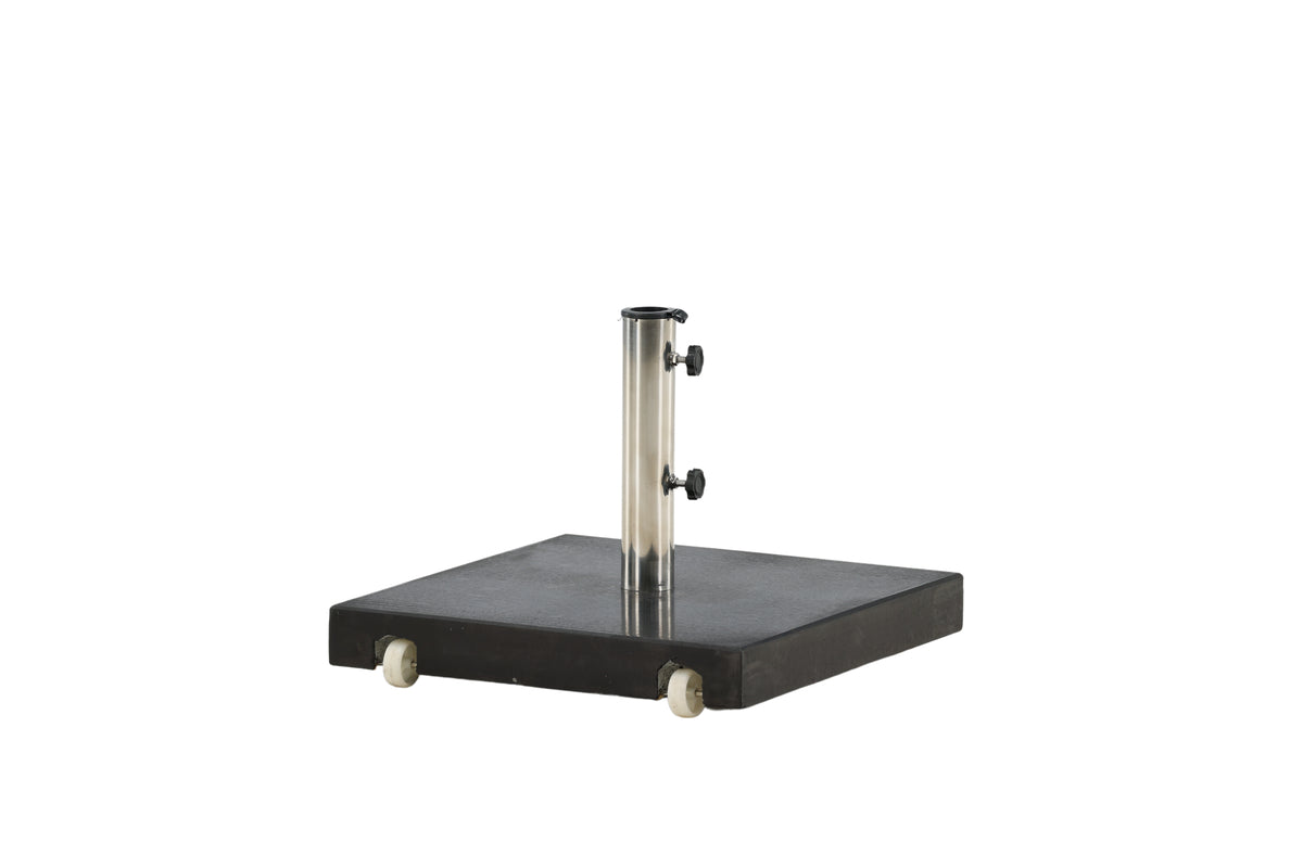 Enkel och stilren parasollsten i svart. Robust konstruktion med två hjul och handtag. Vikt 40kg. Se till att förvara din parasollstenen på rätt sätt. Vid risk för frost, förvara parasollstenen torrt och varmt för att minska risken för frostsprickor.
