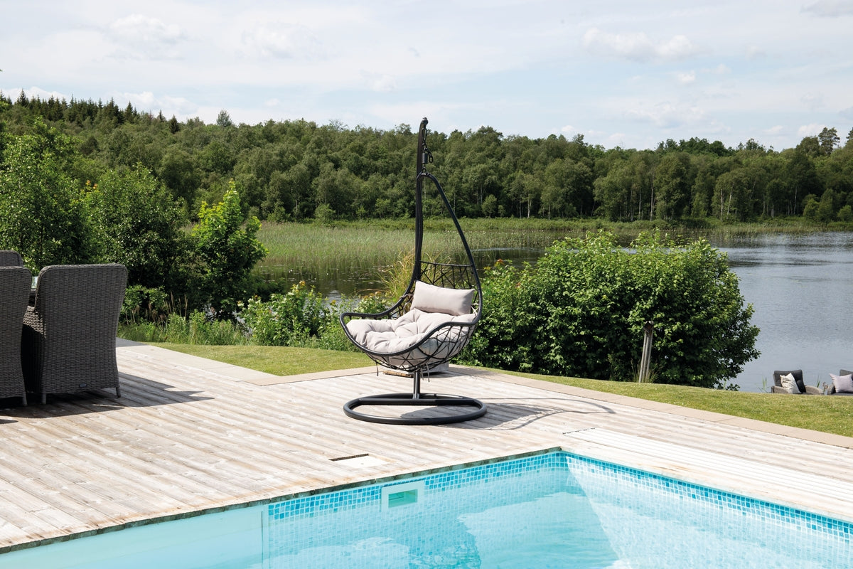 Gör sommarhänget till något alldeles extra i den här läckra hängstolen från serien Vide. Designen är genomtänkt och utformad med ett stativ i svart stål och korg av konstrotting där grå fluffiga kuddar ingår. Möblera uteplatsen med en riktig designikon som inte bara blir ett blickfång i sommar utan även din nya favoritplats att koppla av på.