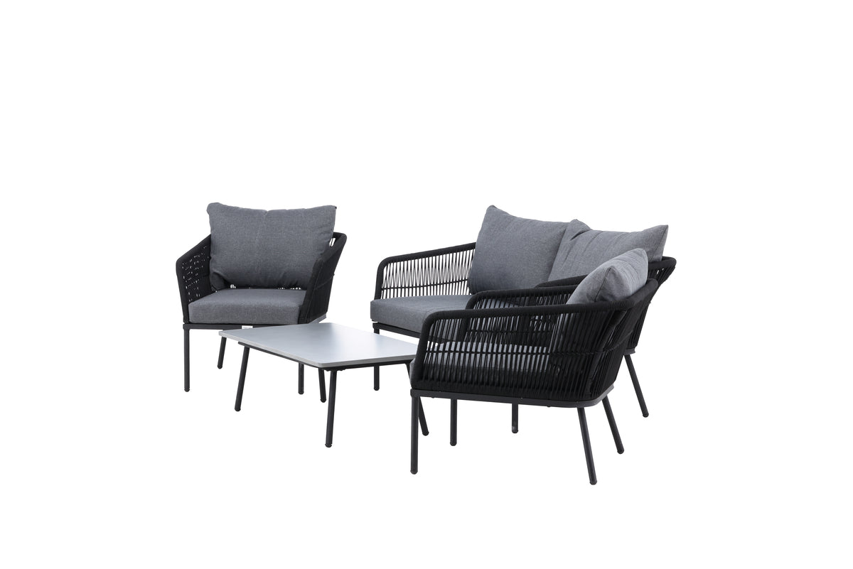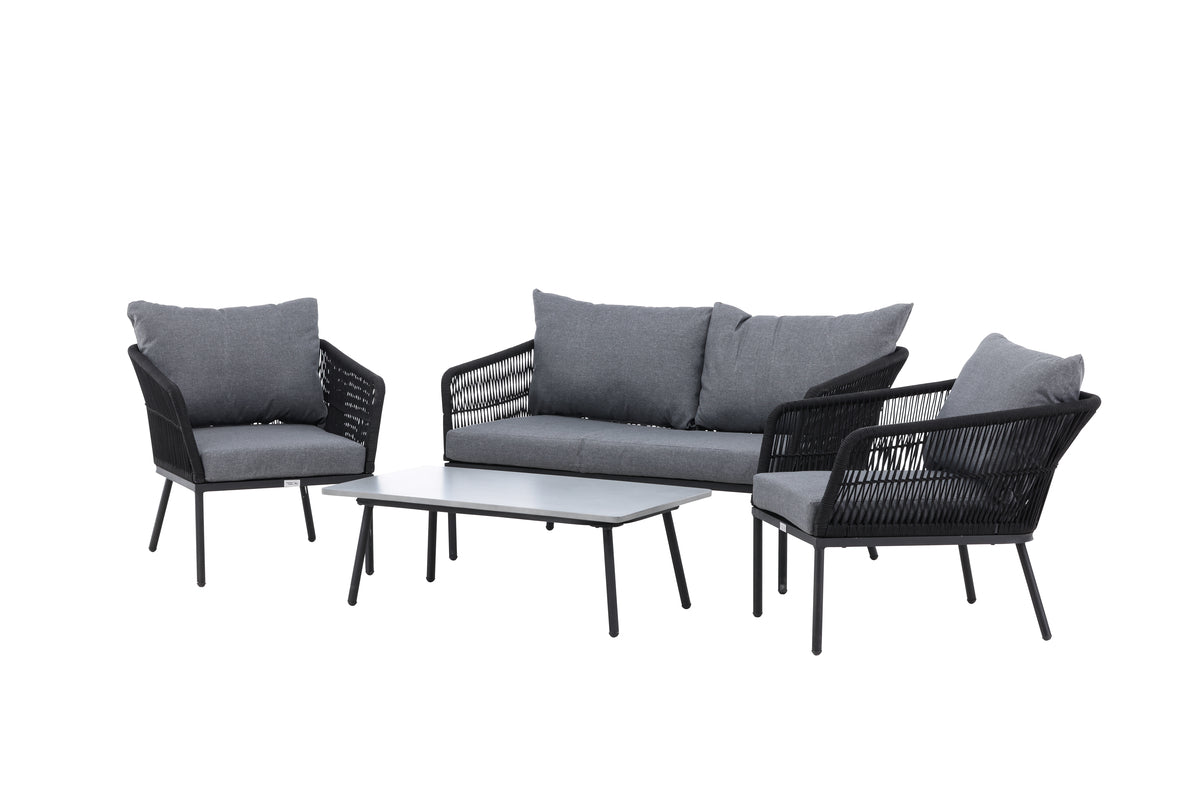 En nätt stilren soffgrupp i modern design. Soffgruppen består av en tvåsitssoffa och två karmfåtöljer tillverkad i en svart pulverlackerad metallram med stilfulla detaljer i ryggen av svart rep inklusive mjuka tjocka grå dynor. Samt ett lågt soffbord med en grå bordsskiva av cement och ett underrede i samma utförande som soffan, tillsammans skapar de en stilfull helhet.