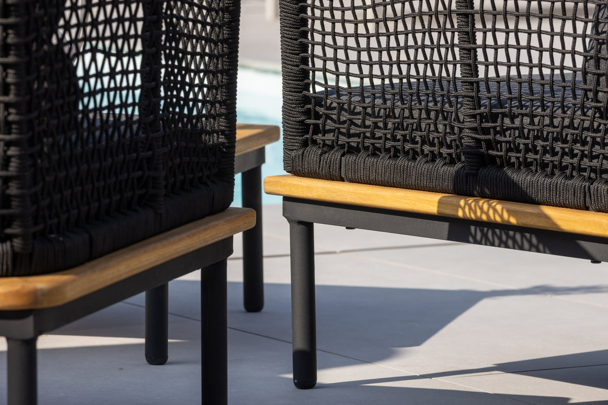 En nätt stilren soffgrupp i modern design från serien Andorra. Soffgruppen består av en tvåsitssoffa och två karmfåtöljer tillverkad i en svart pulverlackerad metallram med stilfulla detaljer i acacia och en rygg i svart rep, inklusive mjuka tjocka mörkgrå dynor. Ett lågt soffbord med en bordsskiva i acacia och ett underrede i samma utförande som soffan, tillsammans skapar de en stilfull helhet.