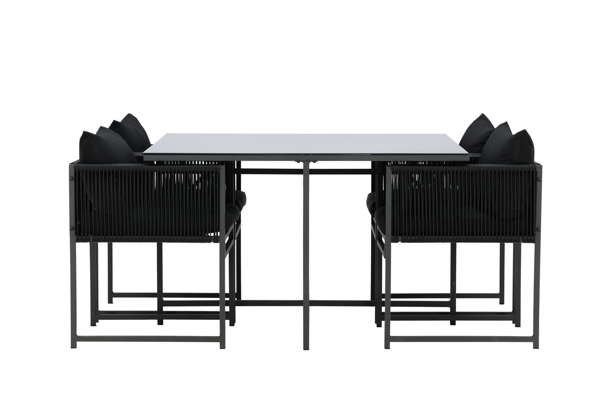 Noto är matgruppen som ger en elegant touch till din uteplats och skapar den perfekta platsen för trevliga middagar. Denna stilrena grupp i svart består av ett stort glasbord och fyra bekväma matstolar, designade för att kombinera estetik och funktionalitet. Stolarna har en robust stålram och är smyckade med snygga repdetaljer på sidan av armstöden, vilket ger en unik och modern karaktär.