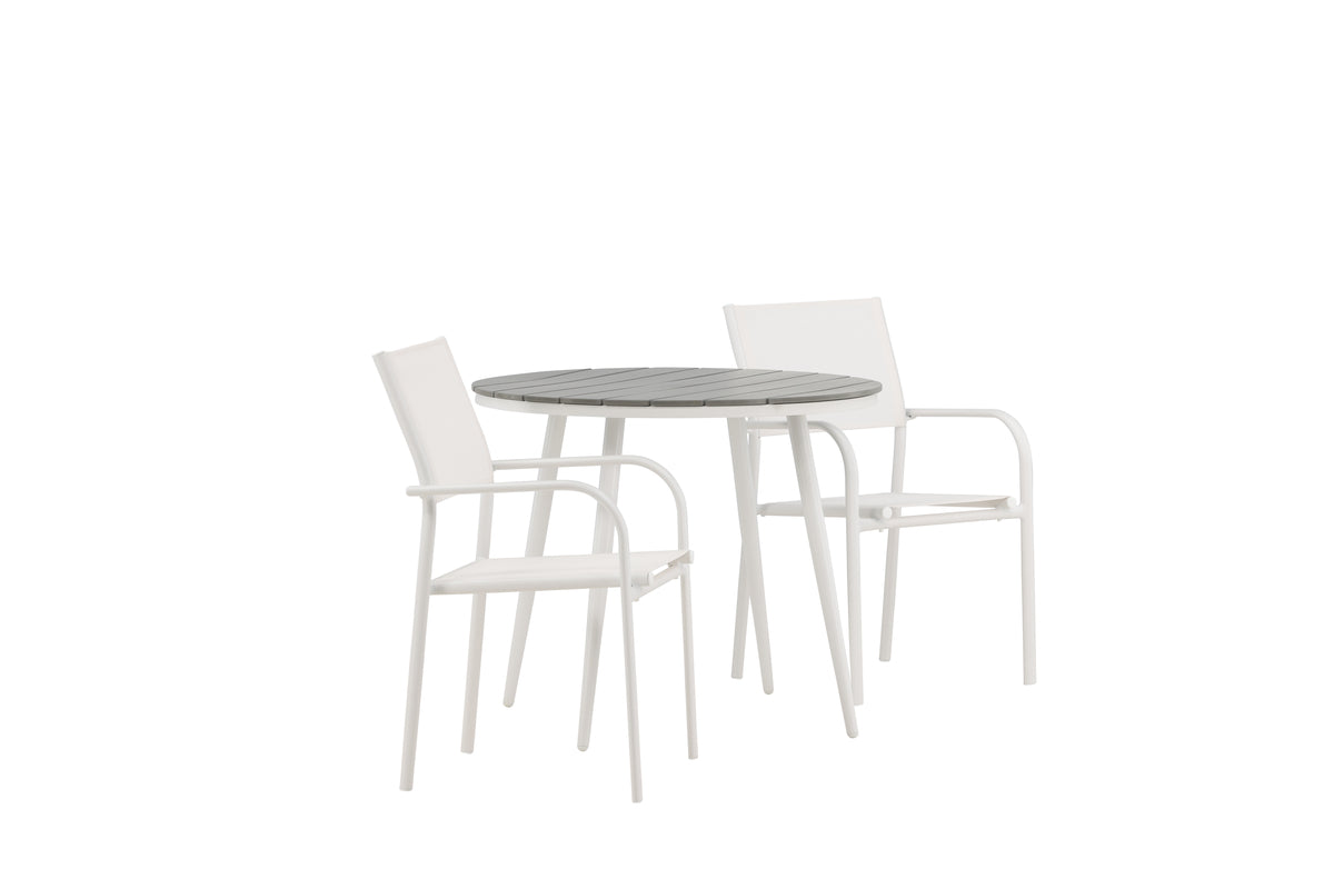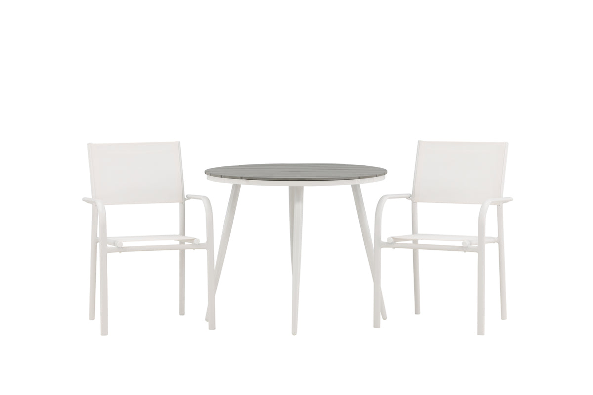 Charmig och inbjudande matgrupp för två - perfekt för sommarens alla fikastunder! Bordet Break har ett klassiskt utförande med en rund bordsskiva i aintwood och ett klassiskt underrede i svart aluminium. Mått: 90ø cm. Här i kombination med 2st matstolar från serien Santorini. Stolarna har raka nordiska former med integrerade armstöd i aluminium och en sits i vit textilene. De är även stapelbara för praktisk förvaring. Skapa en mysig hörna på uteplatsen!