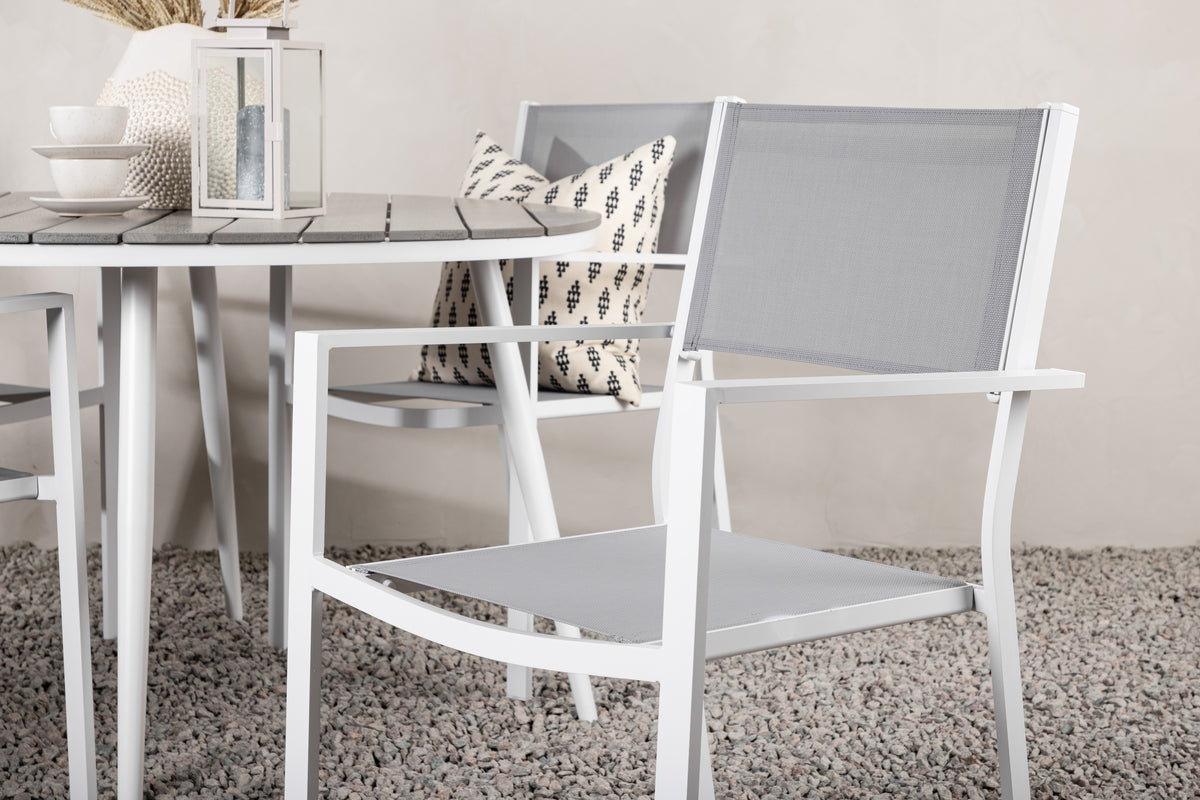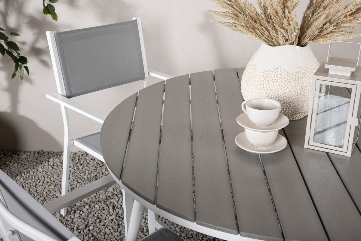 Att köpa en färdigkomponerad matgrupp är både trendsäkert och praktiskt! Den här kombinationen matchar perfekt och färgskalan är enkel att matcha med övrig inredning. Matbord Break har ett klassiskt utförande med en rund bordsskiva i grå aintwood och lätt utsvängda ben i vit aluminium. Mått: 120ø cm. Här tillsammans med våra populära matstolar Copacabana i skandinavisk design. Stolarna är stapelbara med en sits i grå textilene och ram i vit aluminium. Skapa en charmig plats på uteplatsen som passar perfekt till sommarens alla måltider!